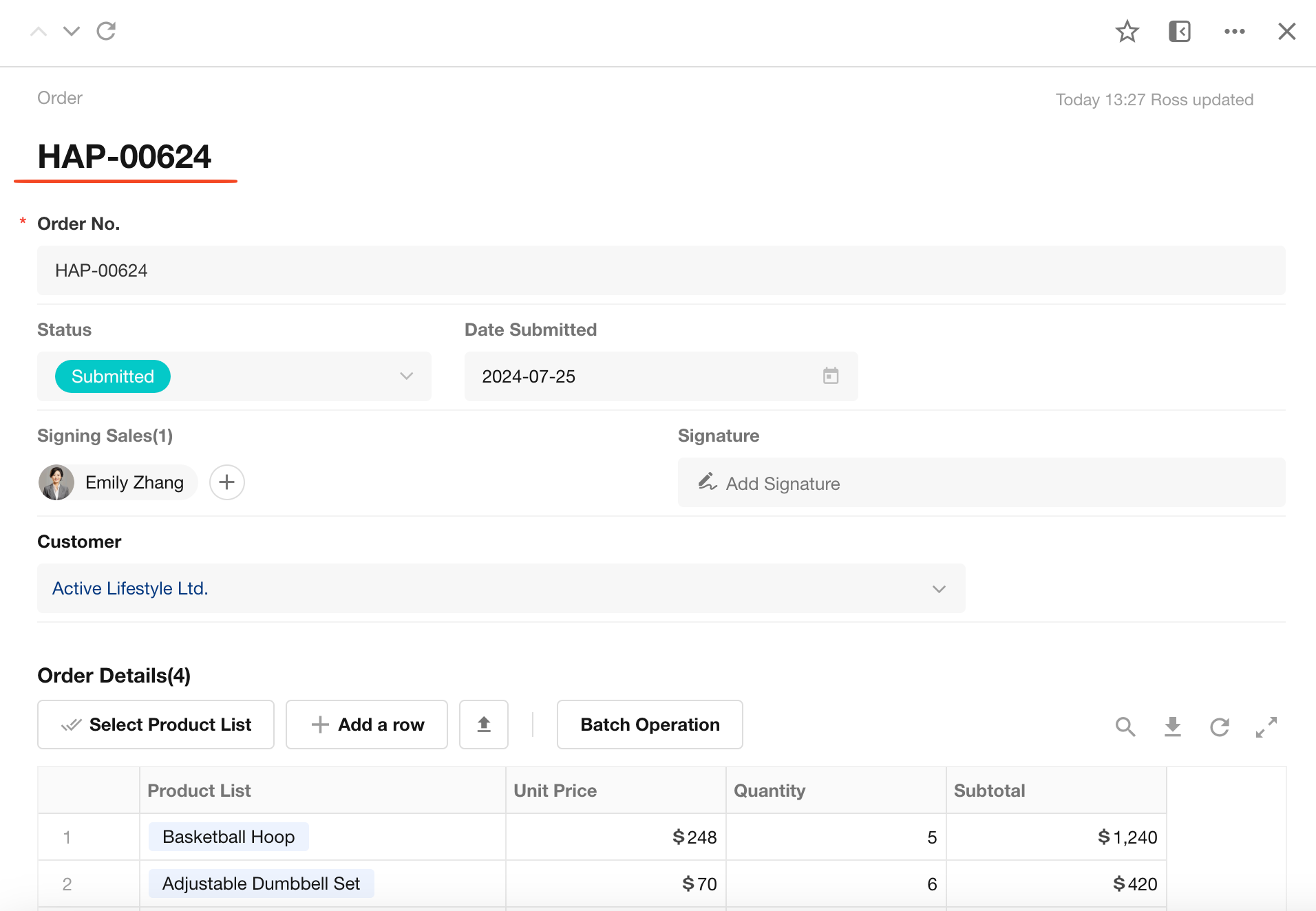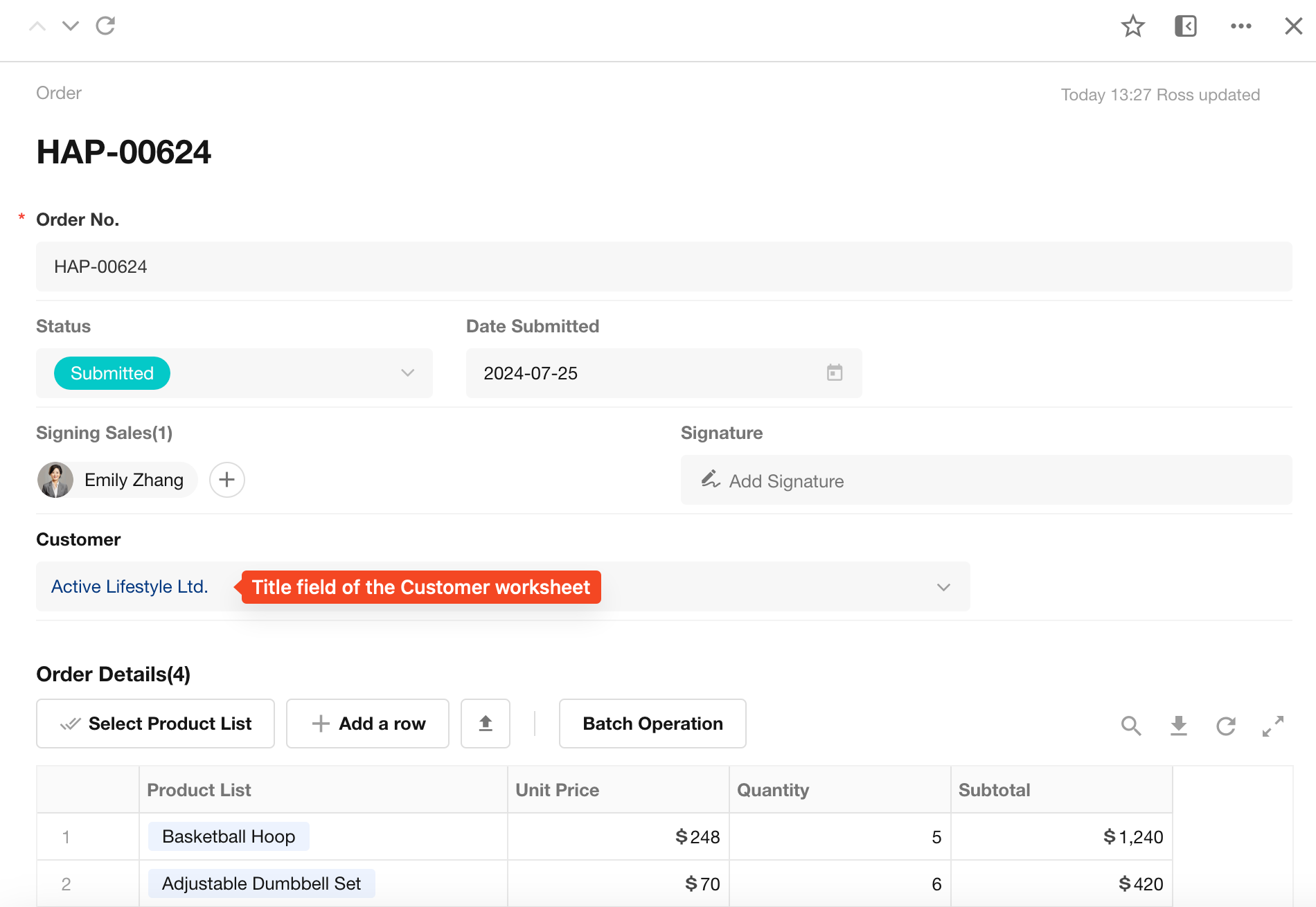 In an Order worksheet, the "Order Number" field can be designated as the title field.