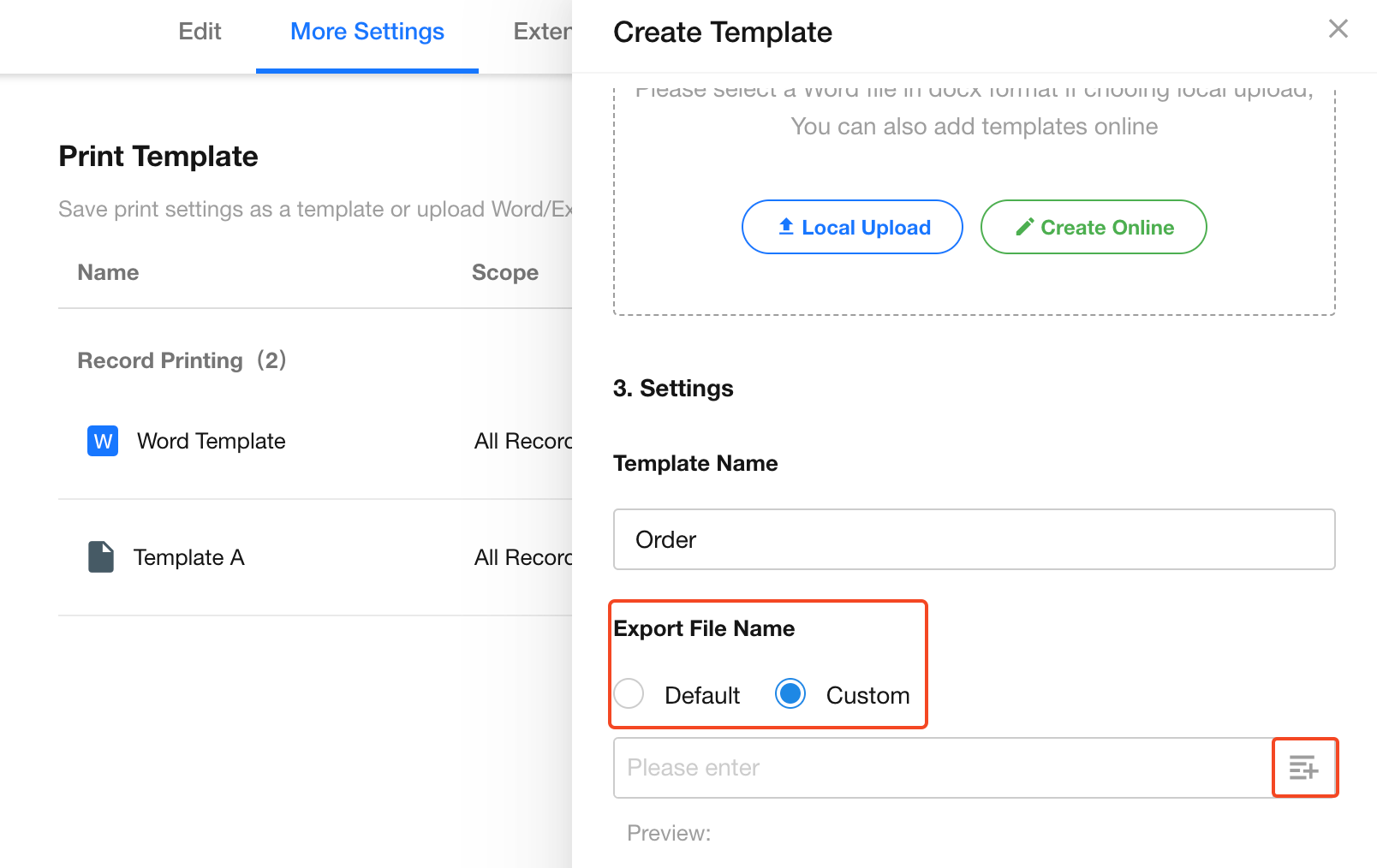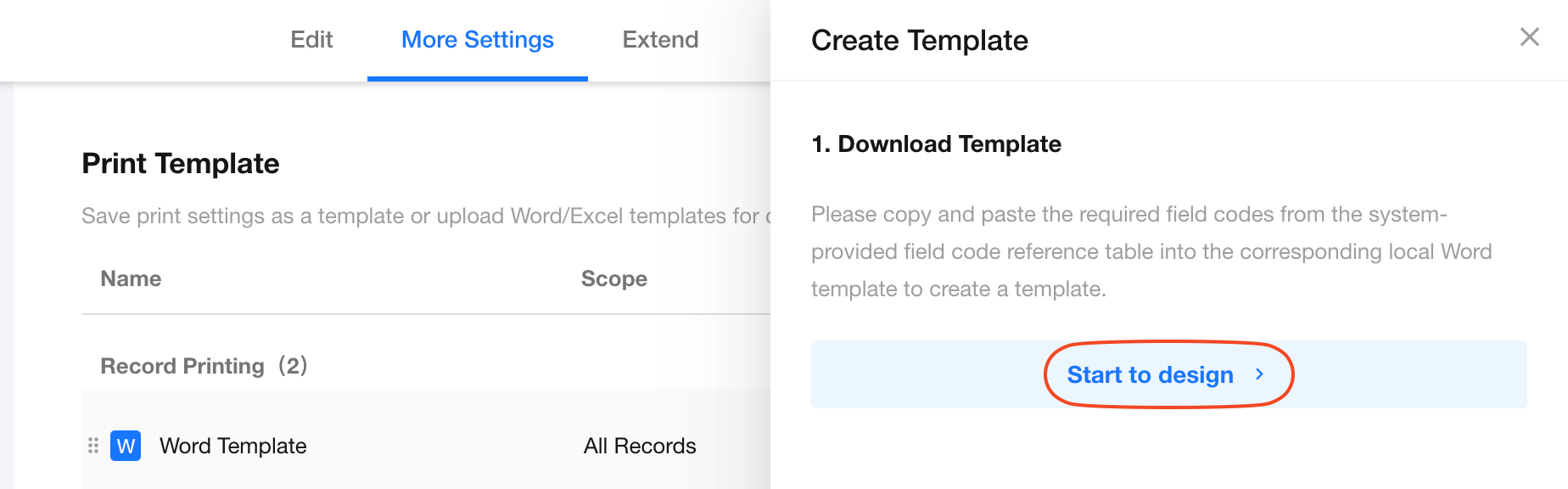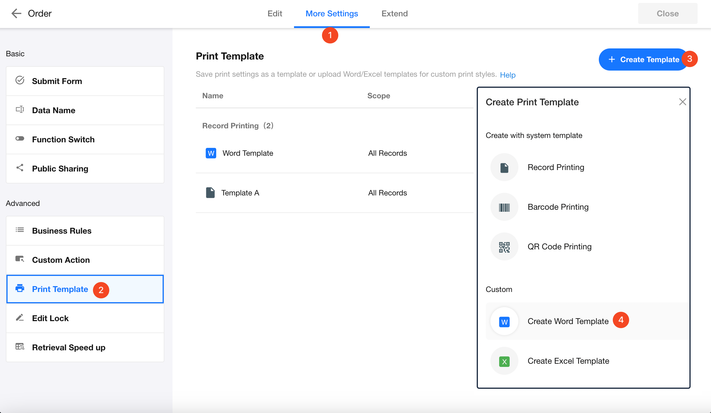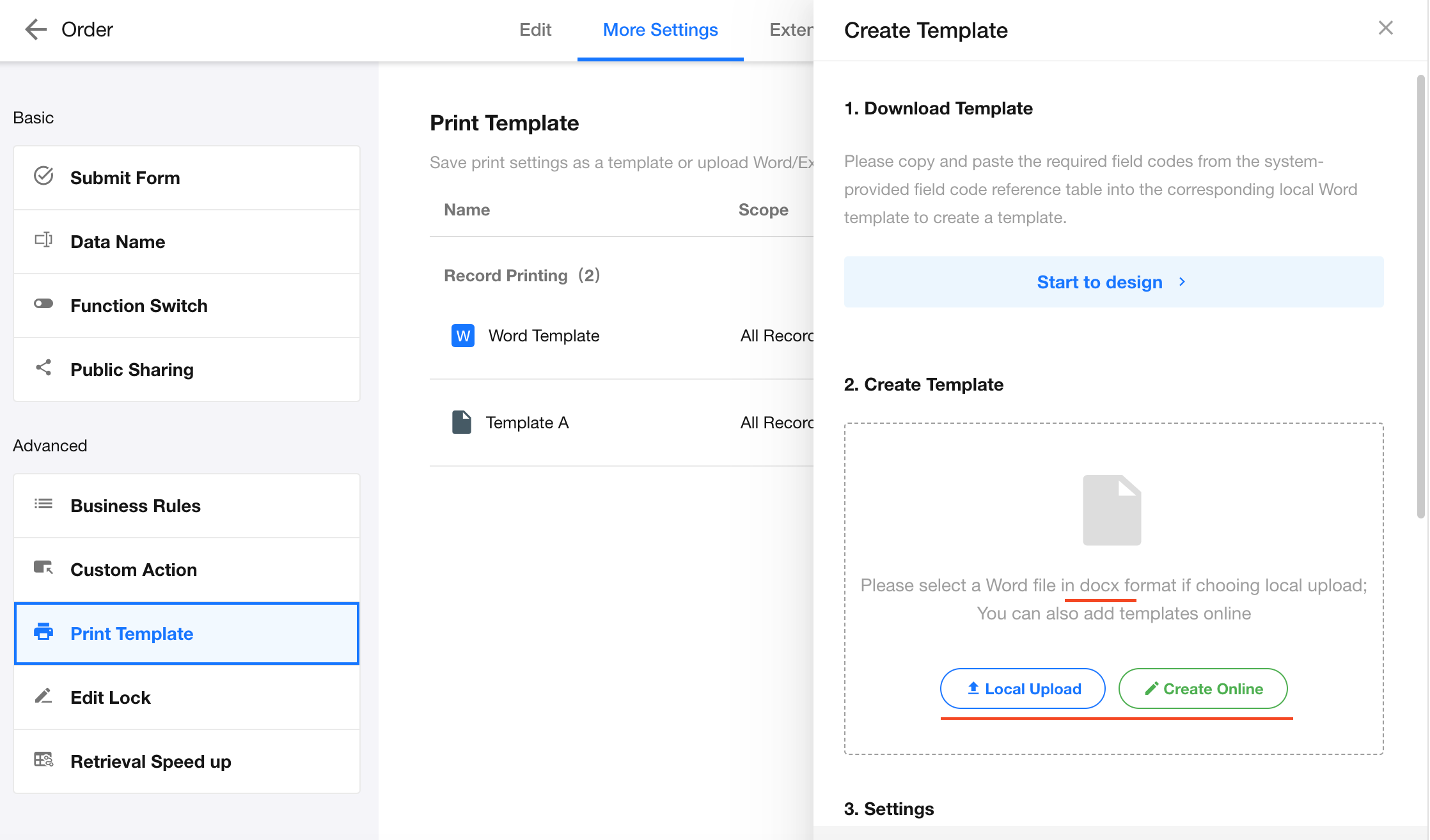 Application administrators can go to the form edit page, then click [More Settings] > [Print Template] > [Create Template] to create a Word print template.