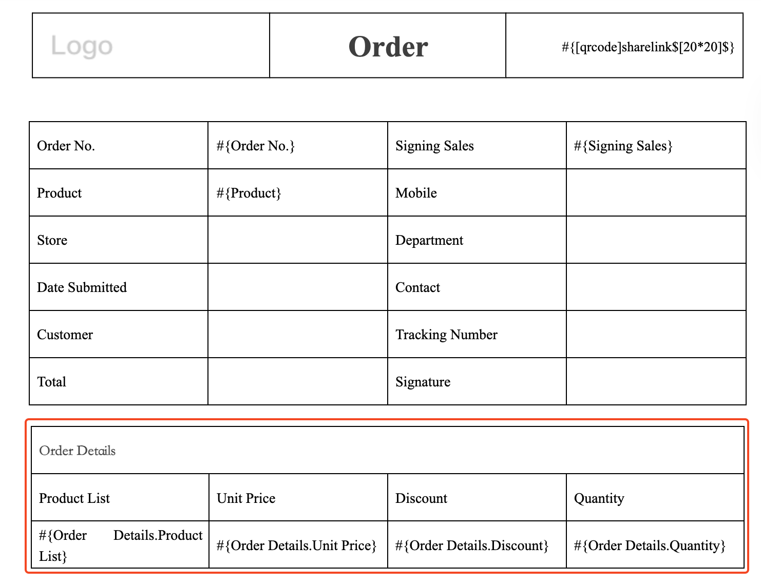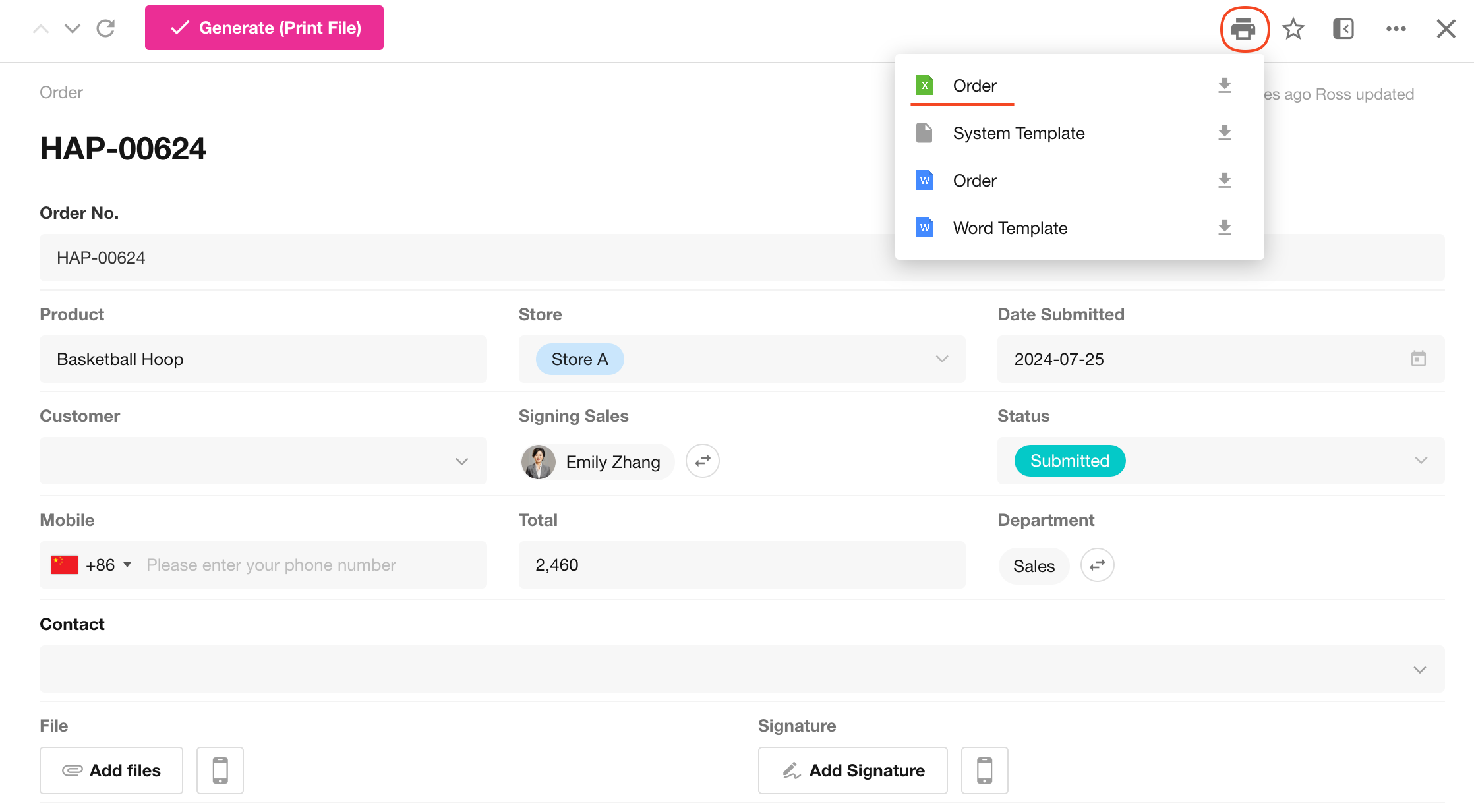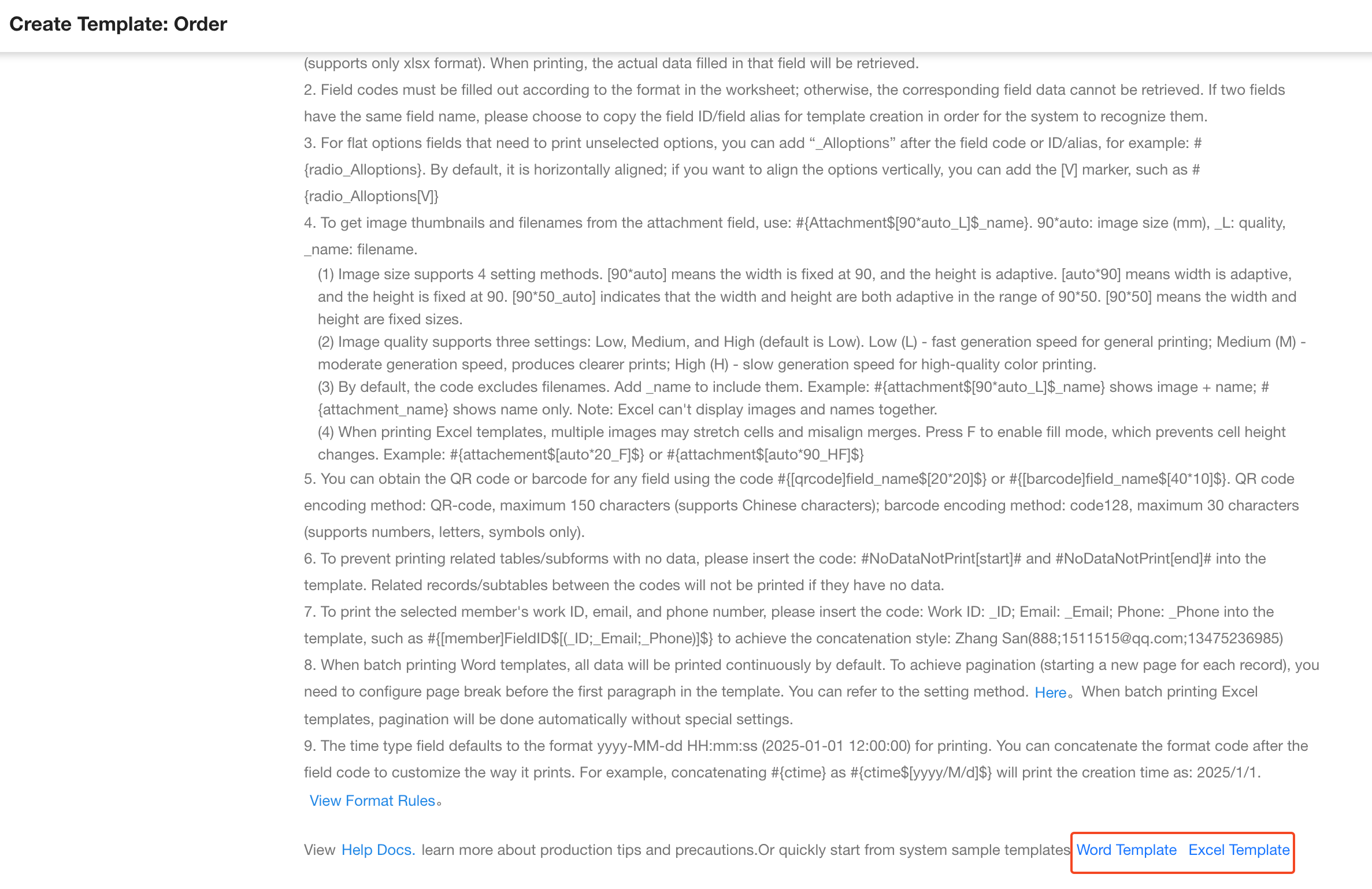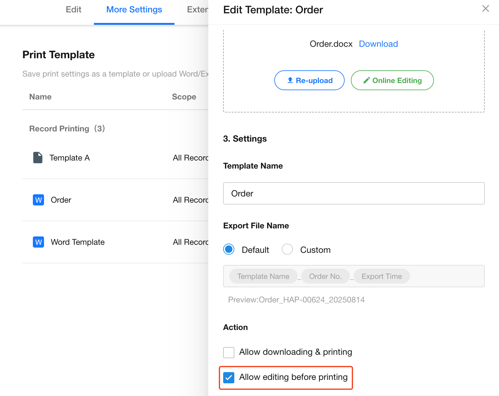 Application administrators can go to the form edit page, then click [More Settings] > [Print Template] > [Create Template] to create a Word print template.