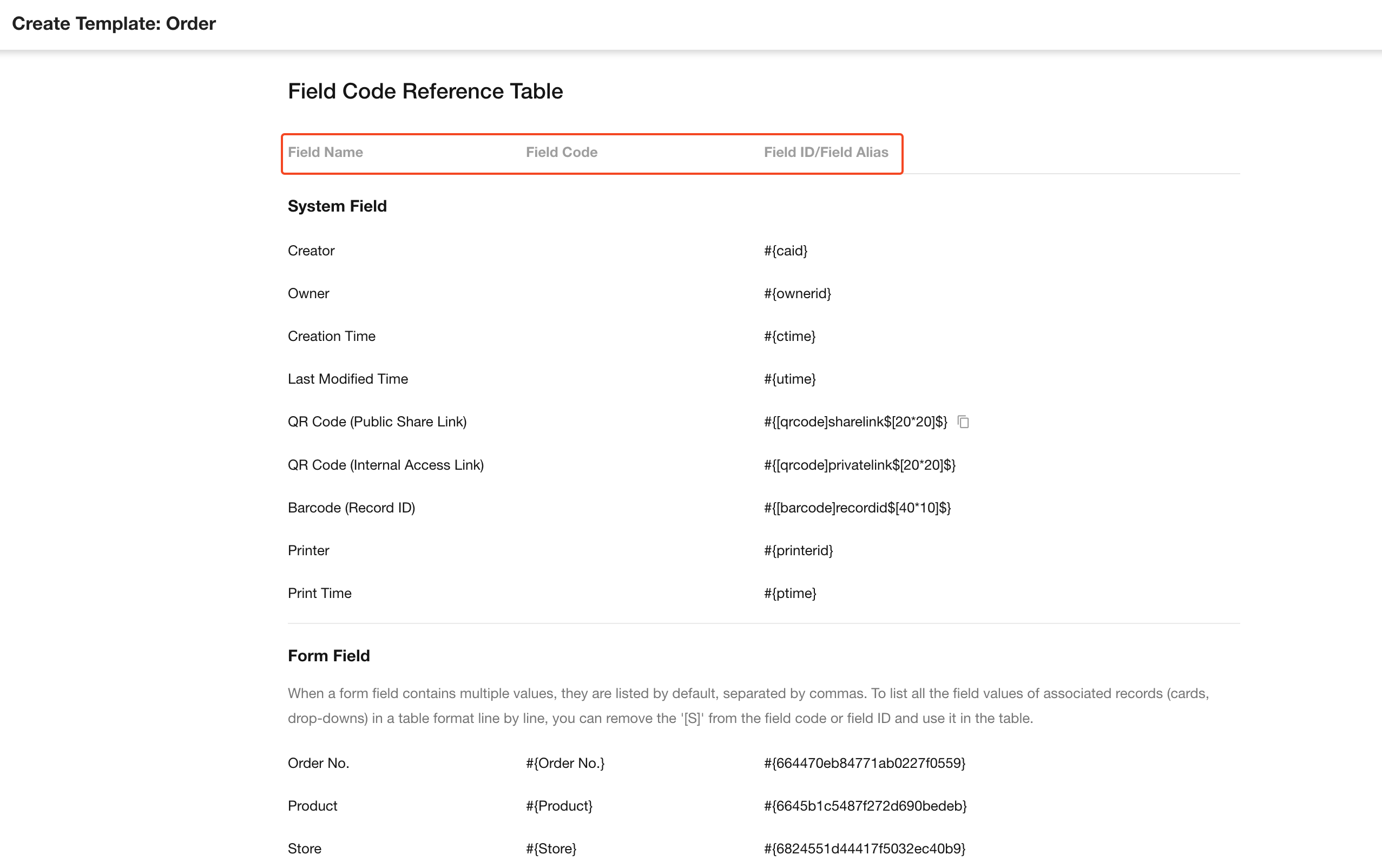 Field ID/Field Alias: Serves the same purpose as the field code, but more precise and unique. If duplicate field codes exist, use the Field ID or alias instead.