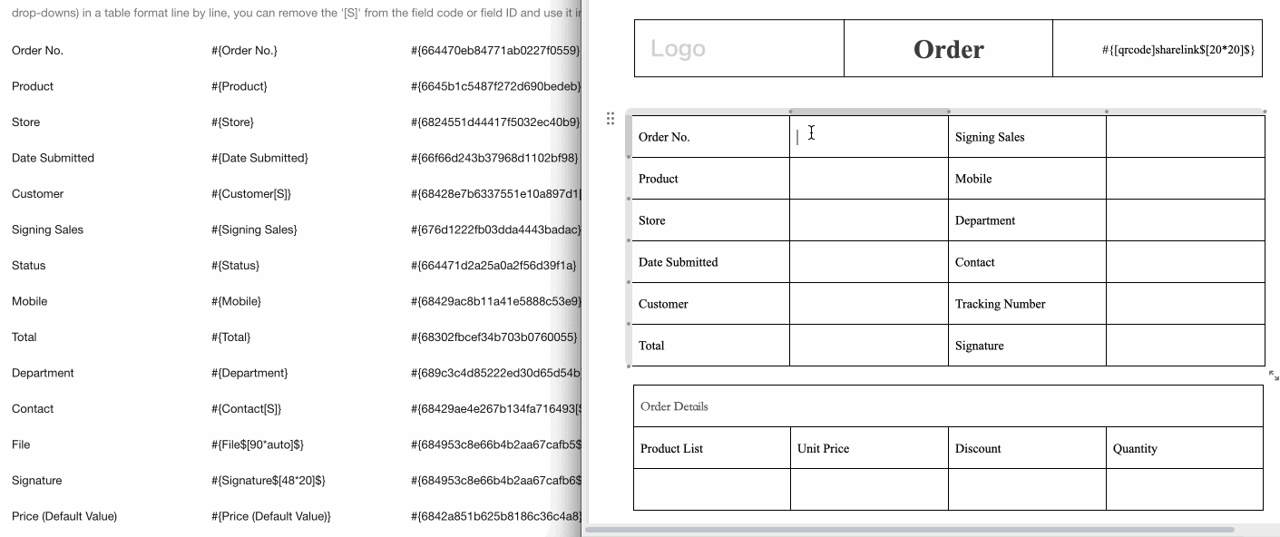 Field Code: A formatted code based on the field name used to identify the field. Paste this code into the Word template to populate the corresponding data.
