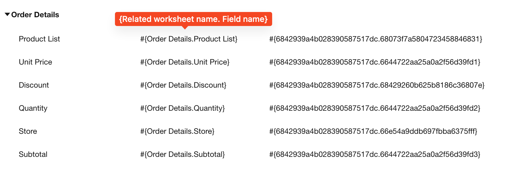 To print in this format, paste the corresponding field codes into the desired cells. Below is an example of how to insert codes for fields in the current worksheet and related worksheets.