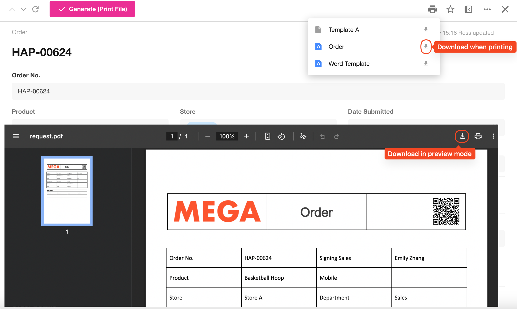 To download: After clicking “Print" with template, simply hit the download button, or use the download button in preview mode.