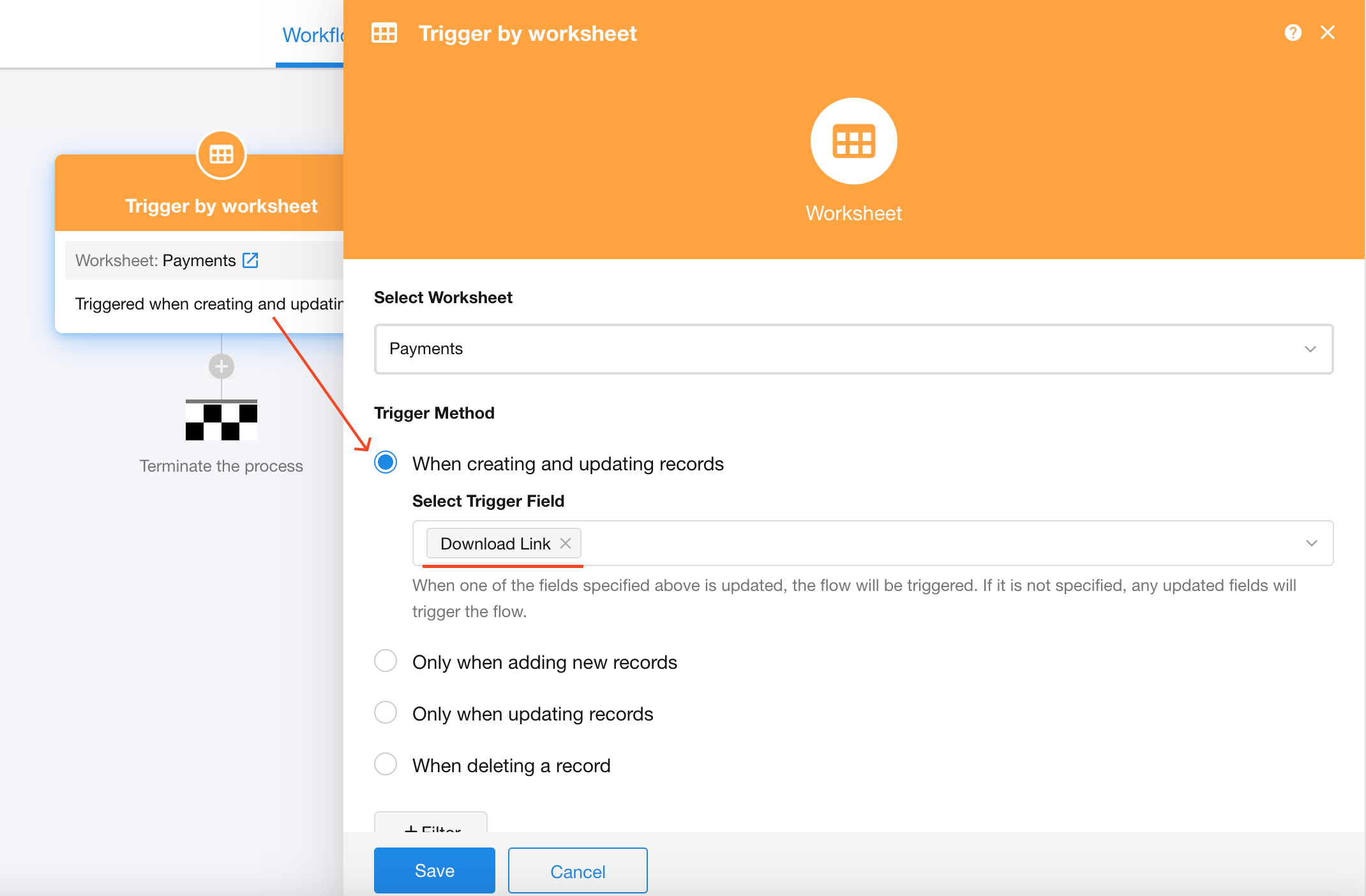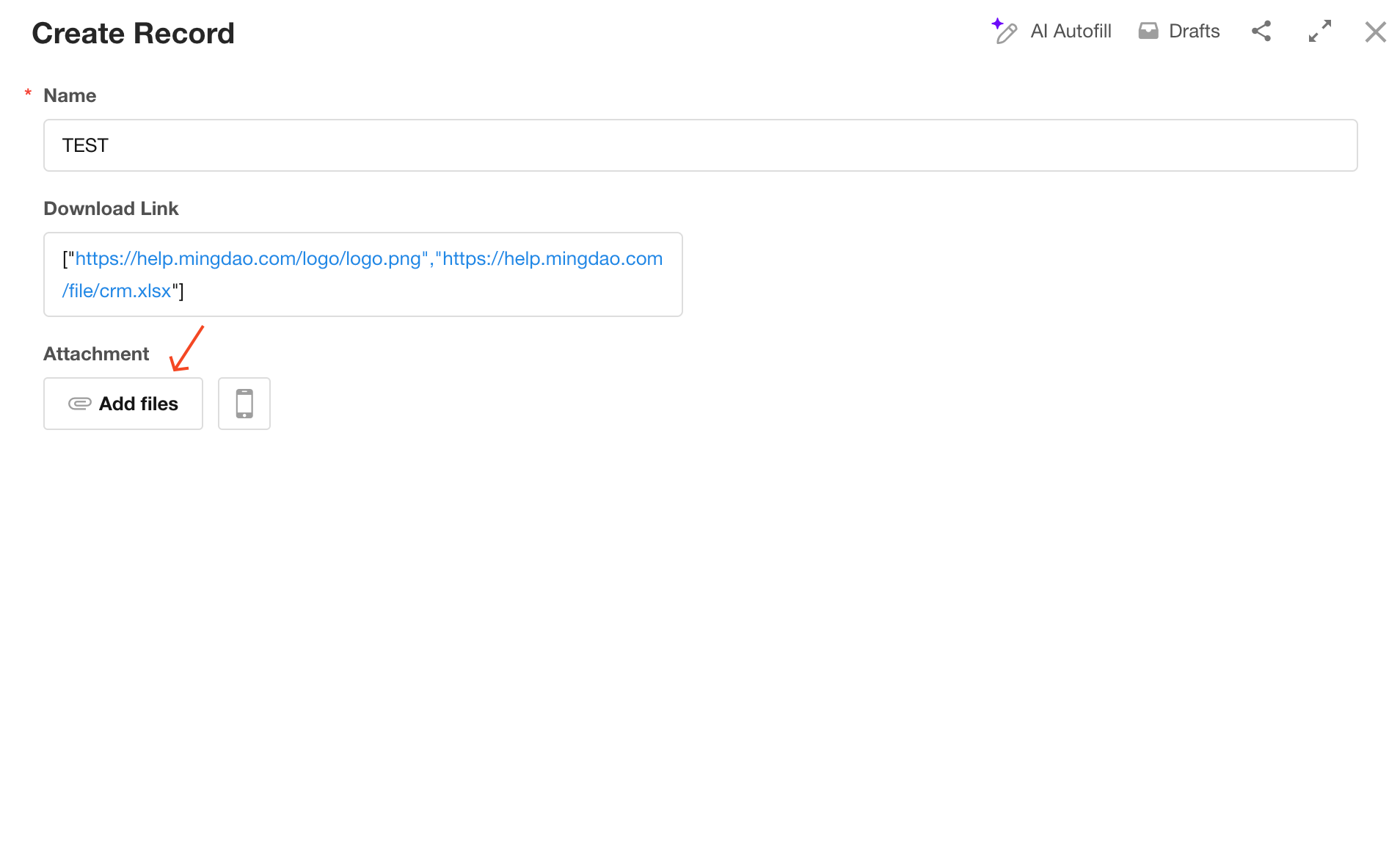 In the example below, the file download URLs are first saved to a text field named Download Link, and then a workflow automatically downloads and saves the file to the Attachment field.