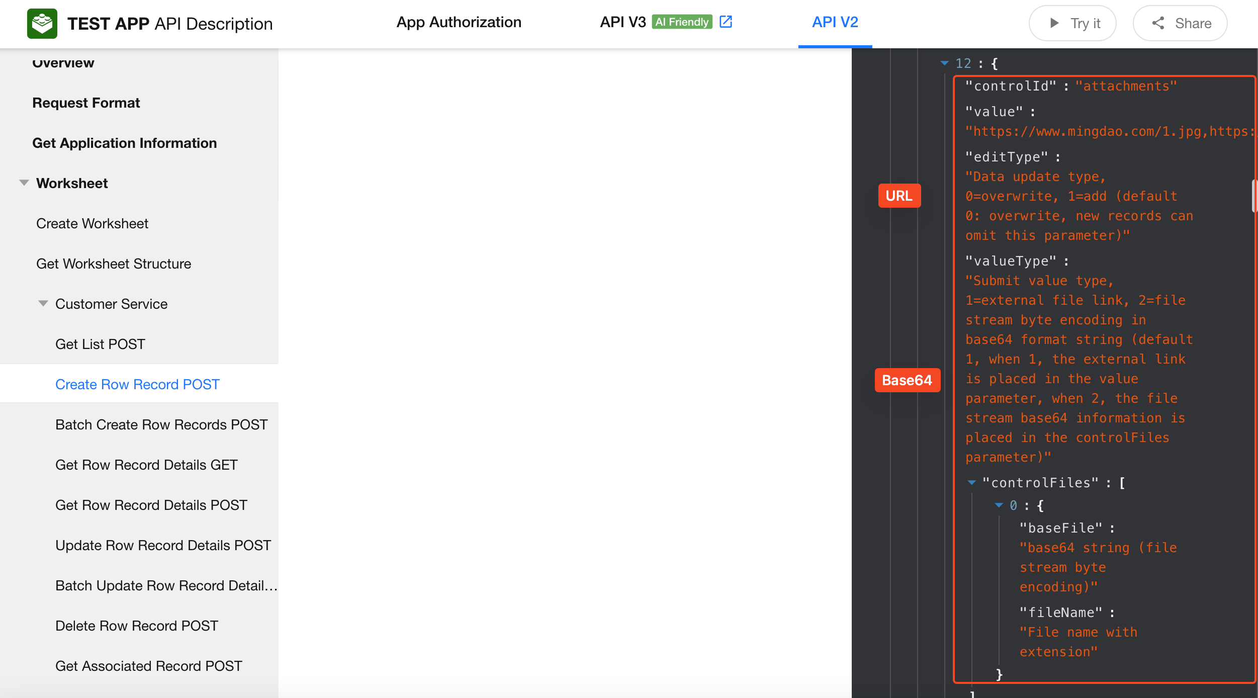 "valueType":1//Upload method: 1 = external file URLs (default) — use the `value` parameter, 2 = base64 encoded file stream — use the `controlFiles` parameter below;