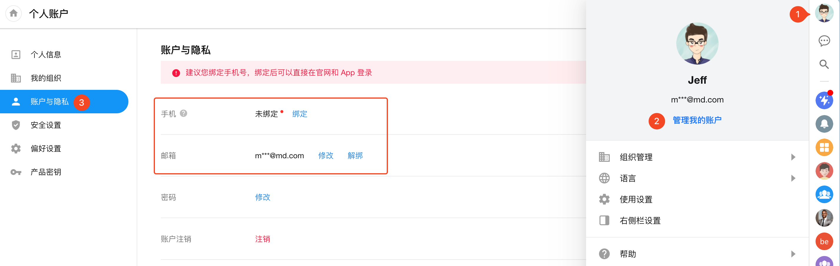 点击系统头像后,进入“管理我的 账户” - “账户与隐私” ,可对手机号或邮箱绑定或解绑。
