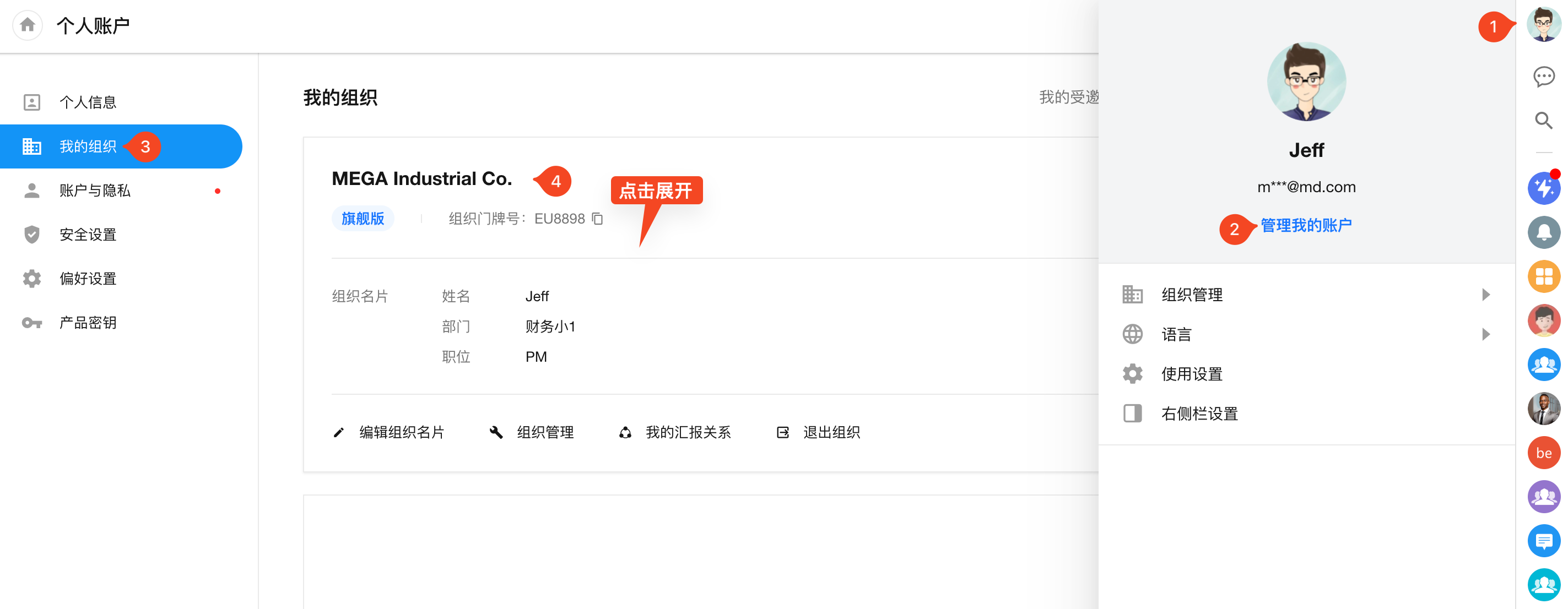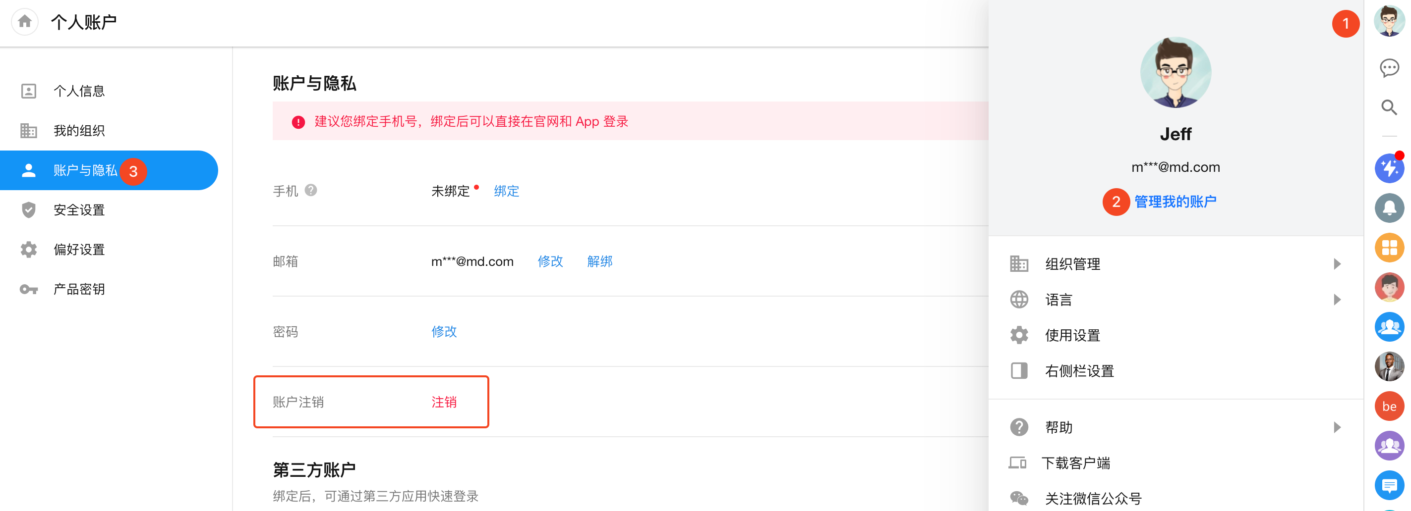 如果您需要注销账号,或退出不再使用的组织,可以按下面的方法操作: