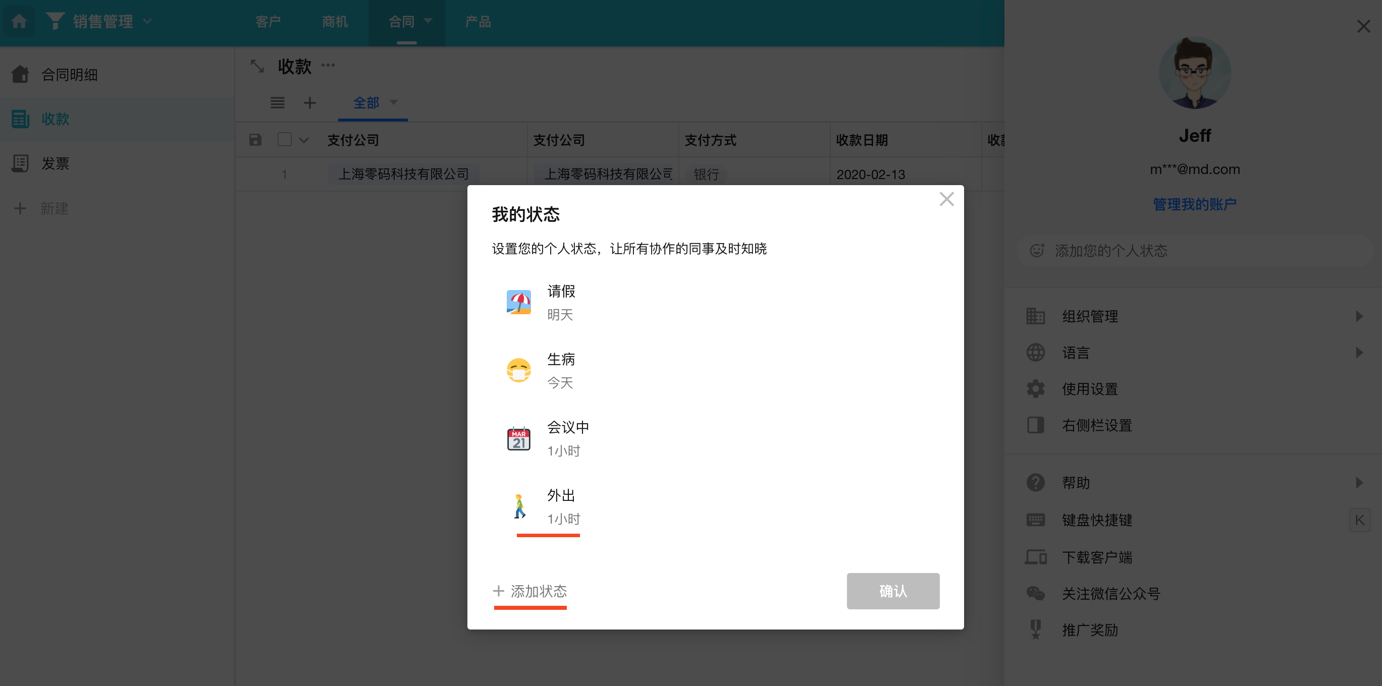 系统默认提供 4 种状态:请假、生病、会议中、外出。