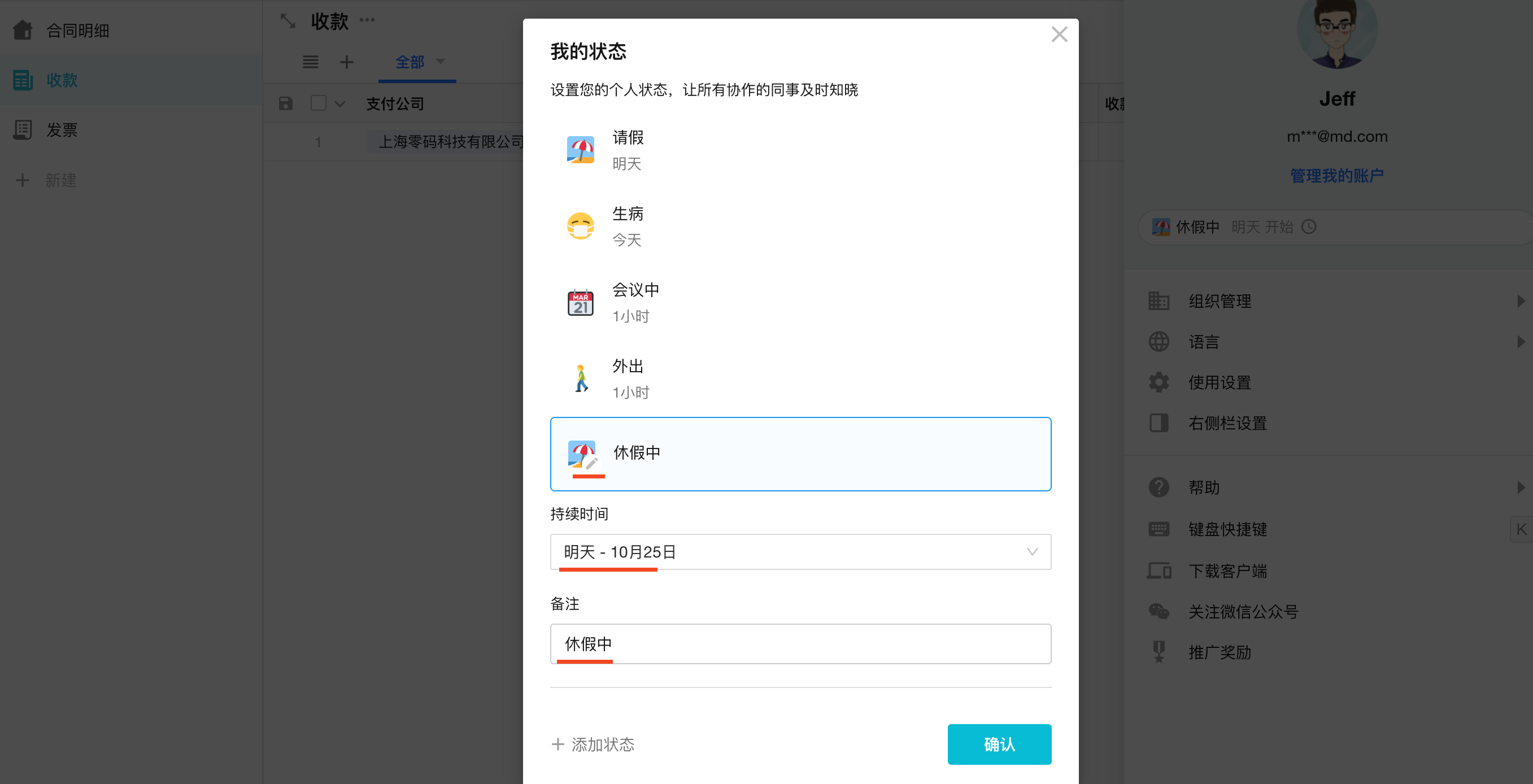 设定该状态的持续时间与备注说明。 状态持续时间结束后自动清除个人状态。