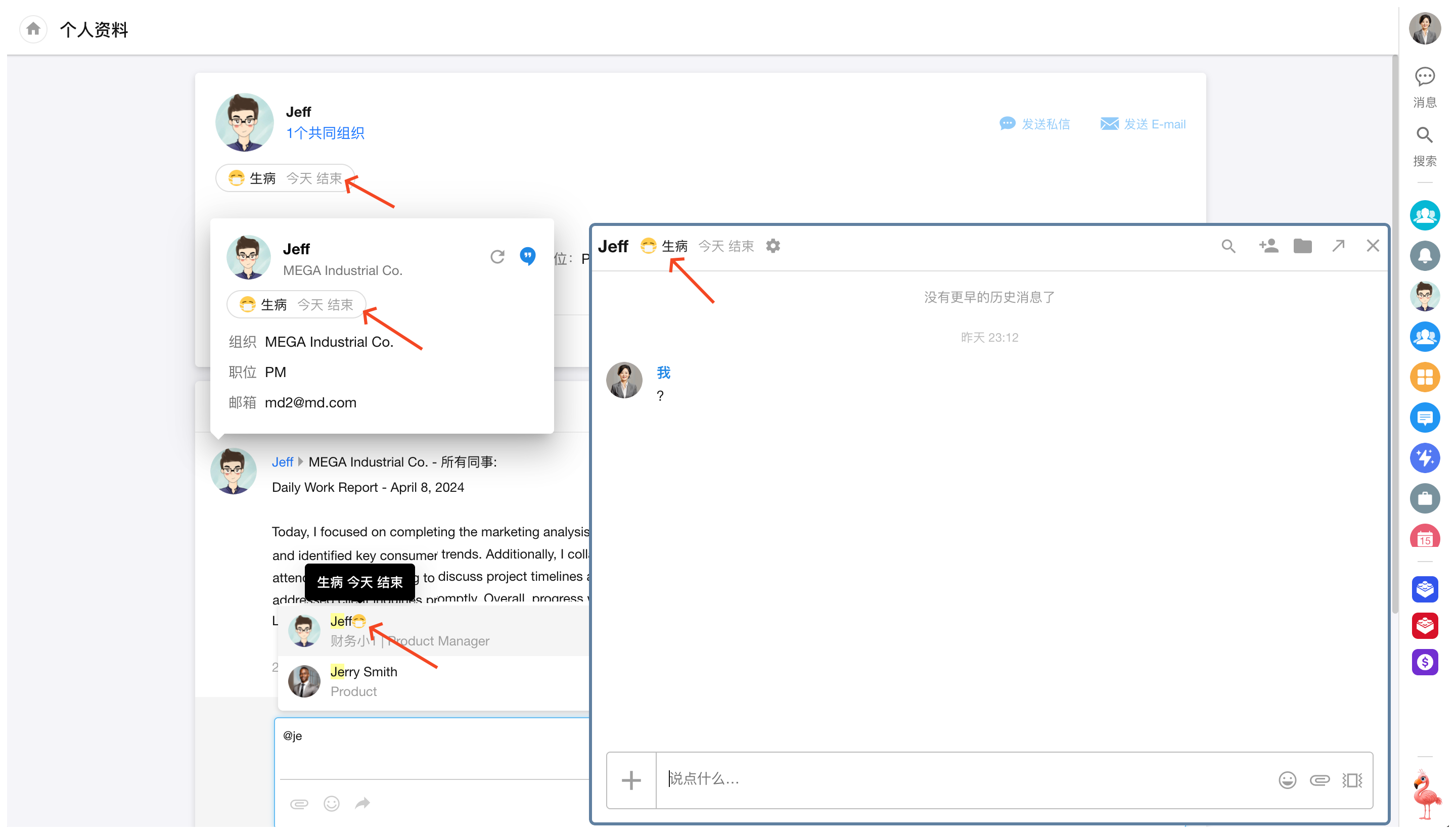 在请假、外出或开会时,设置个人状态。同事在聊天、名片或资料页可快速看到你的状态。