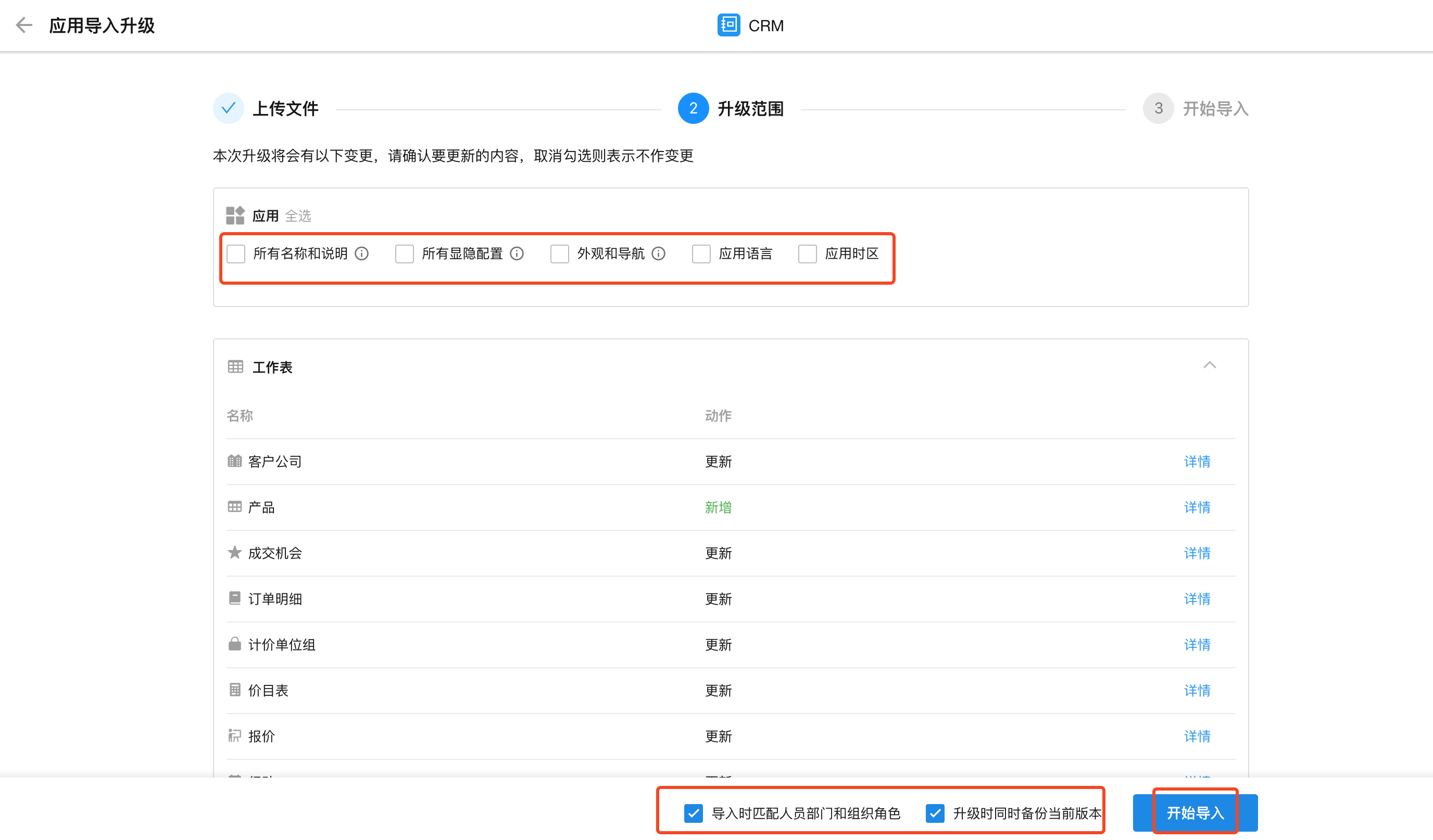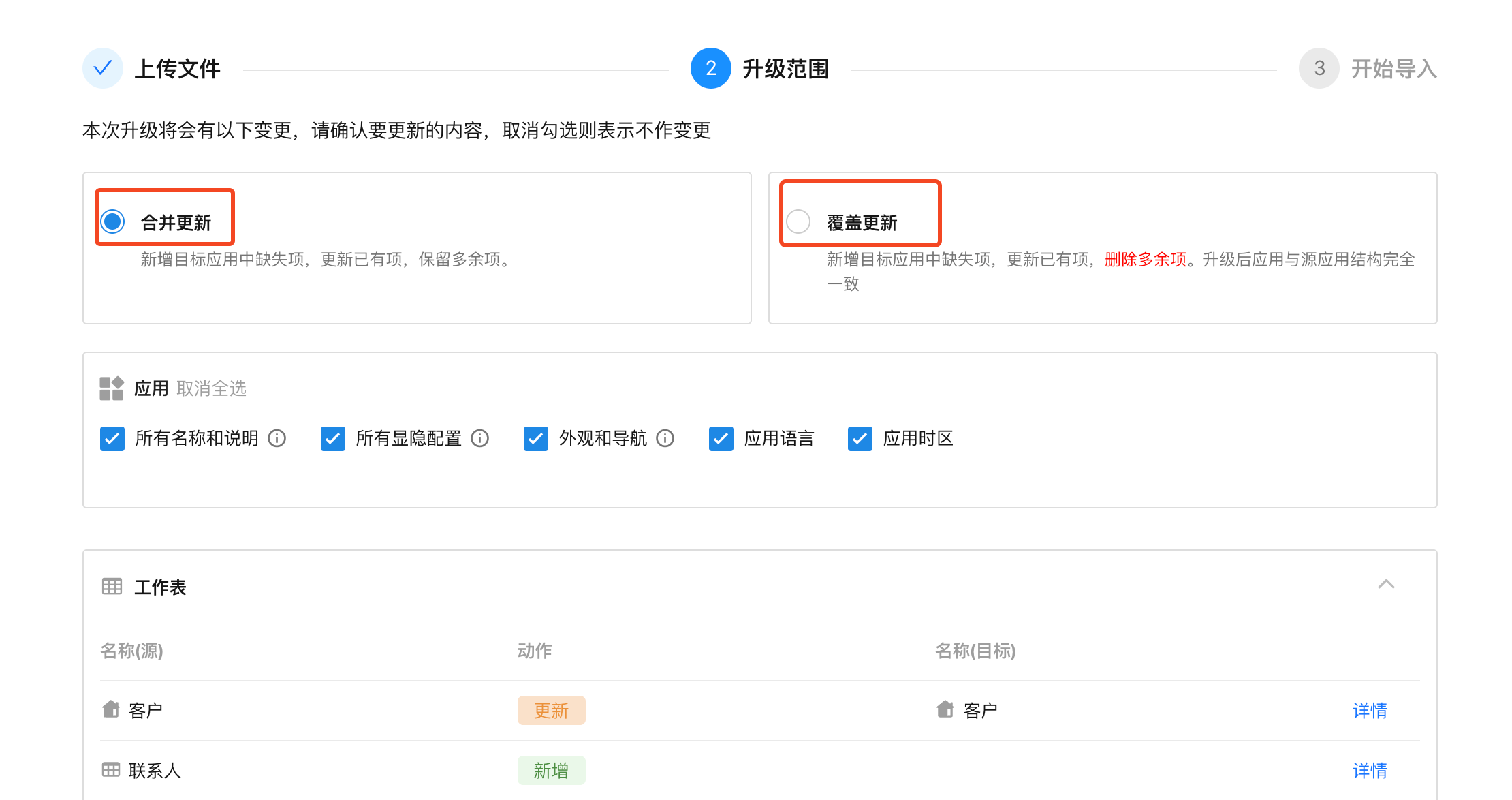 勾选后,升级时将覆盖更新应用项、视图、工作流、角色的名称和说明