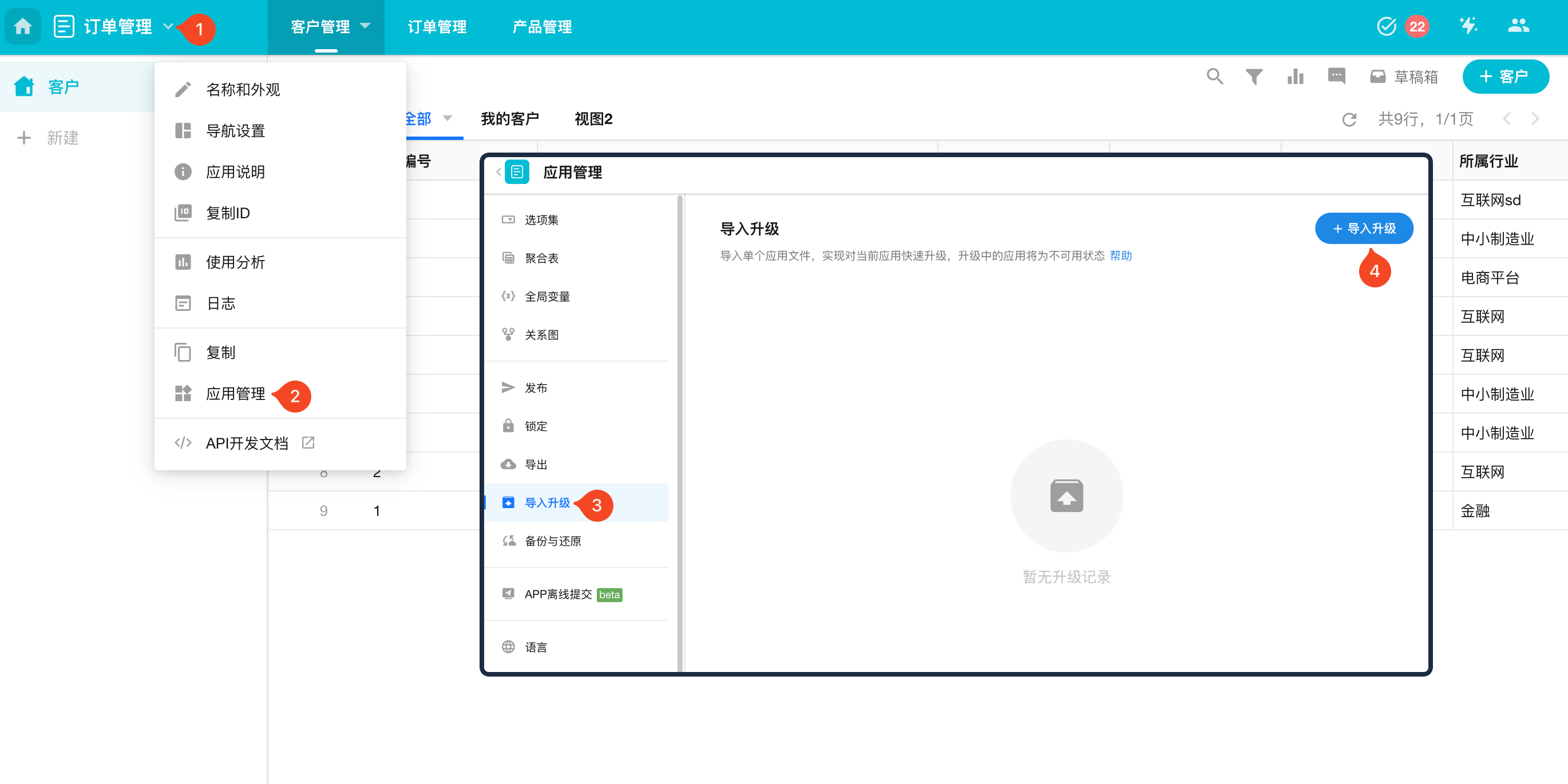 应用的导入升级功能支持将源应用的配置调整通过导入操作同步至目标应用,实现配置或功能的快速迭代升级,避免重复搭建和手动修改。