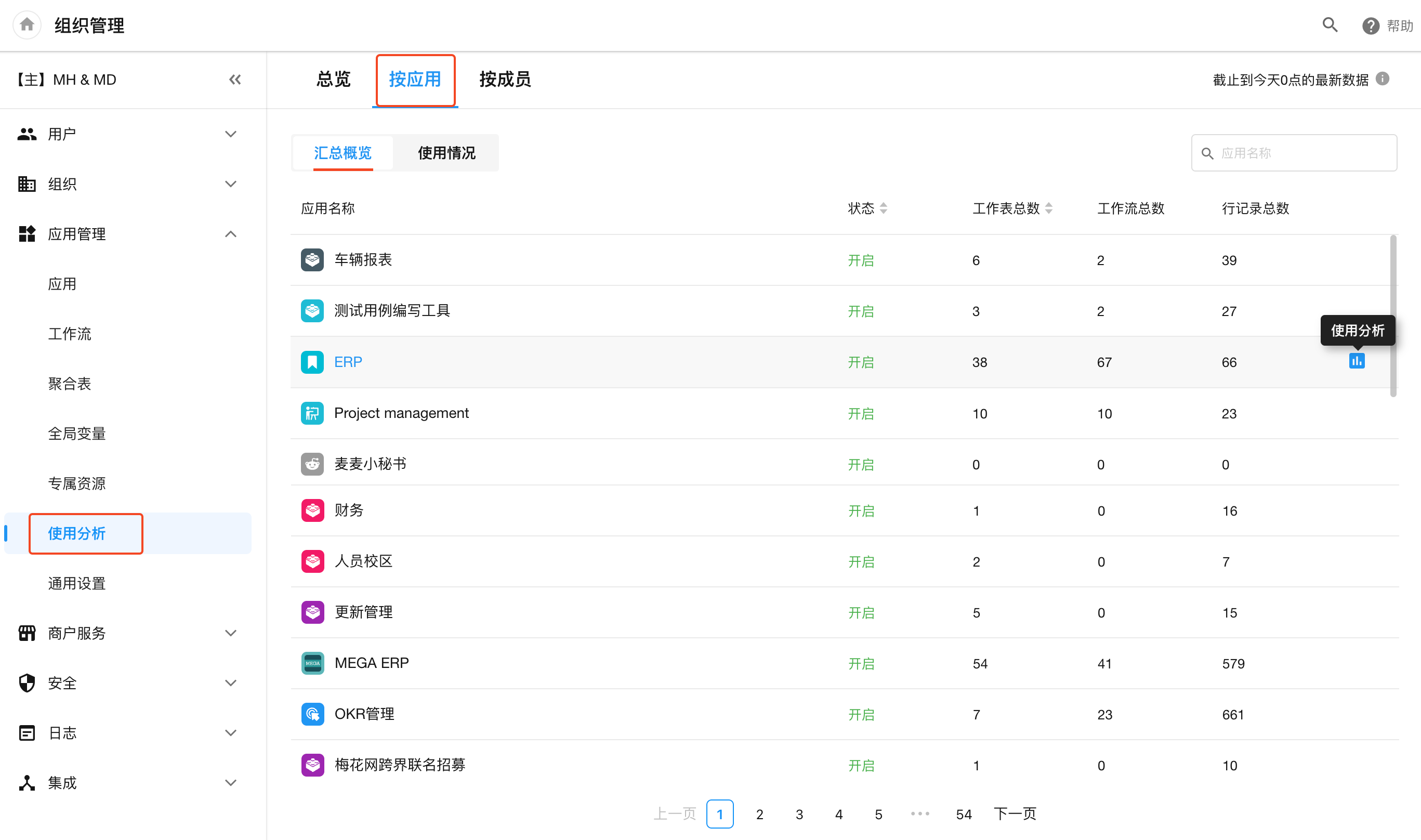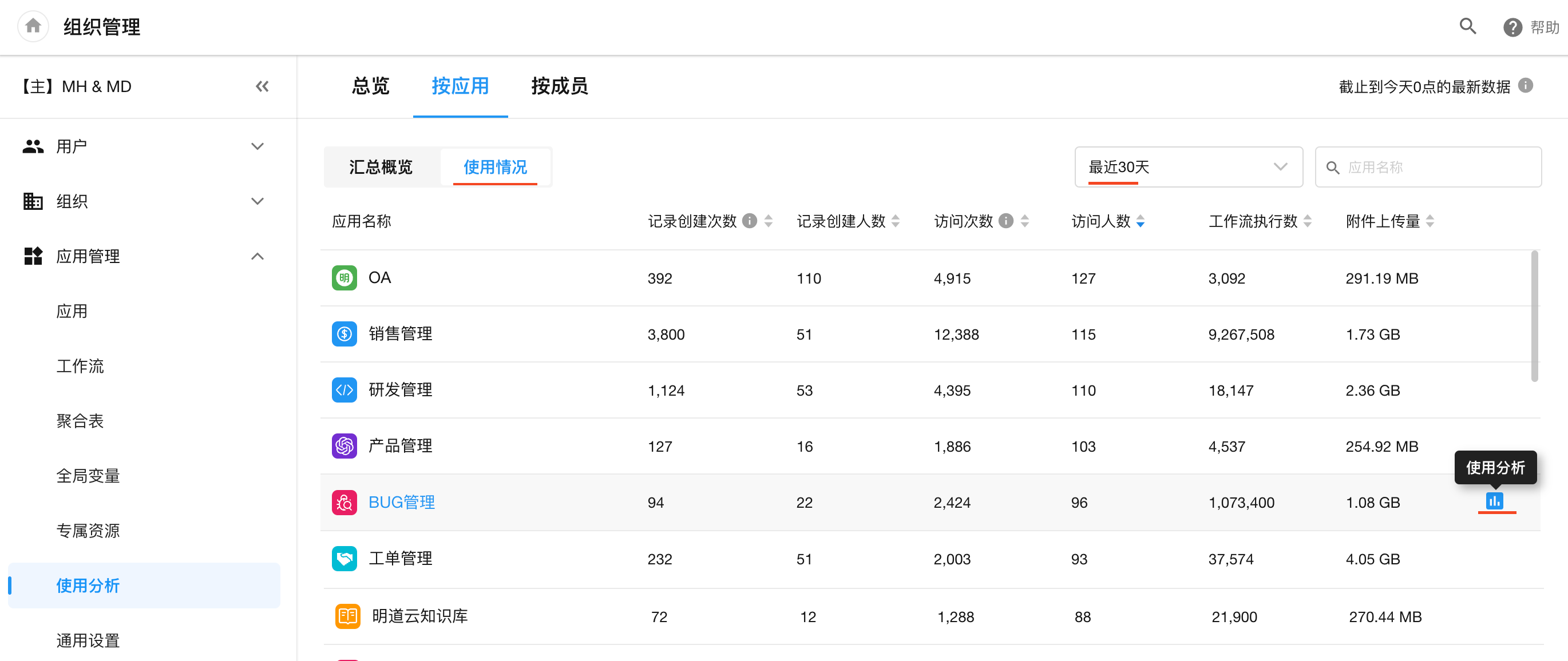 使用分析功能可以帮助管理者随时了解组织内应用的使用情况或成员的使用活跃度等多种指标,主要分两种: