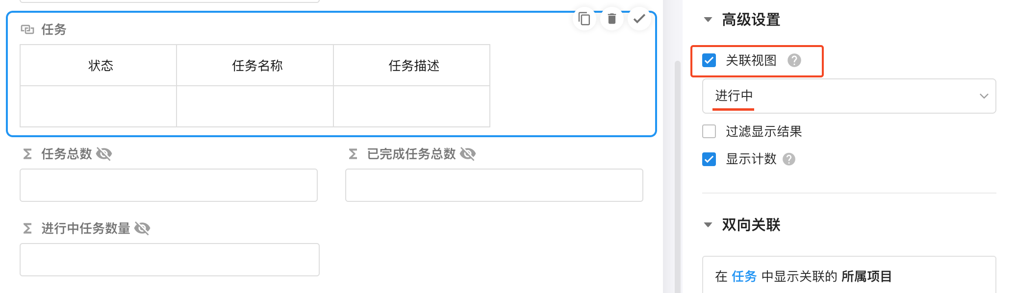 配置方法: 只需在项目表中关联任务表的“关联记录”字段中,选择对应的关联视图即可。
