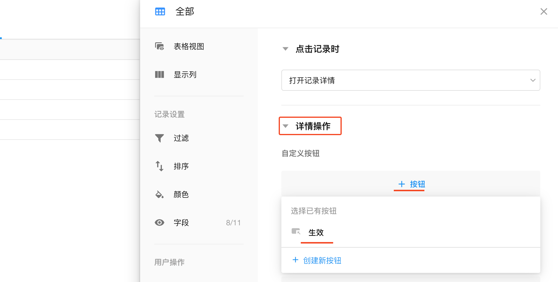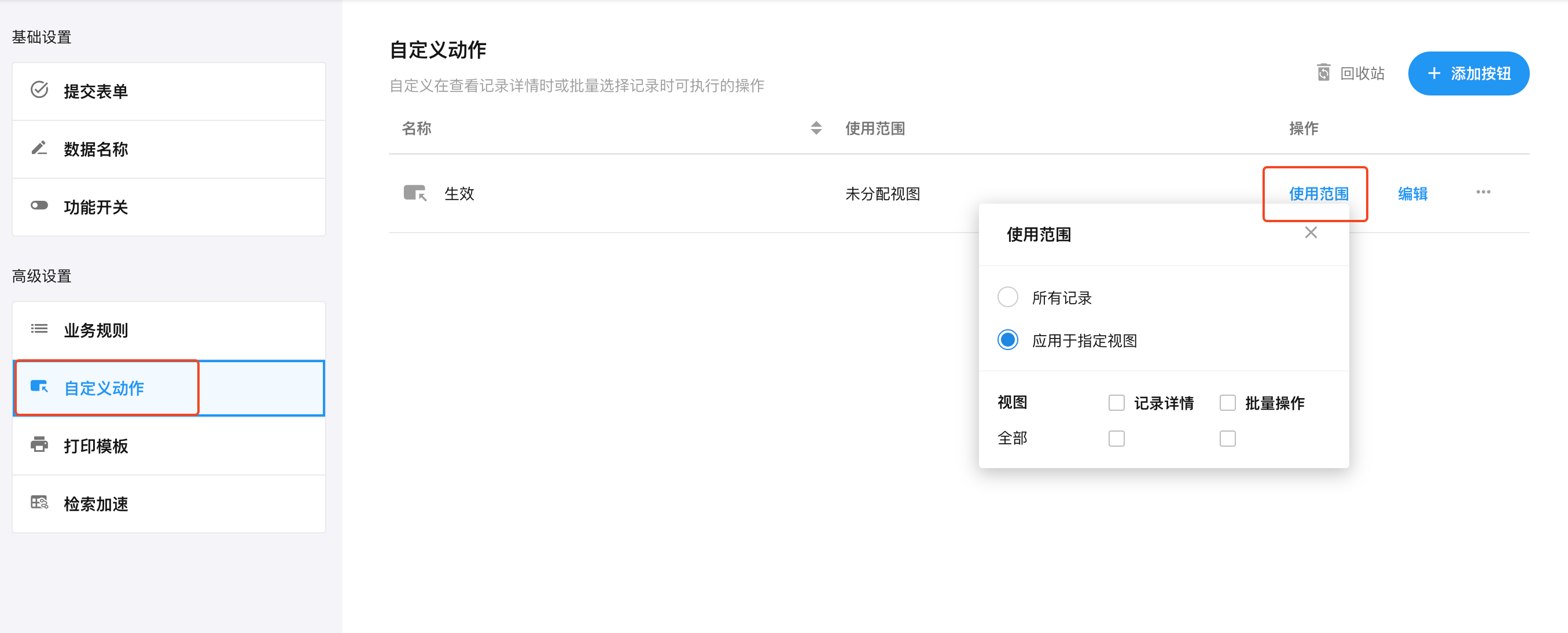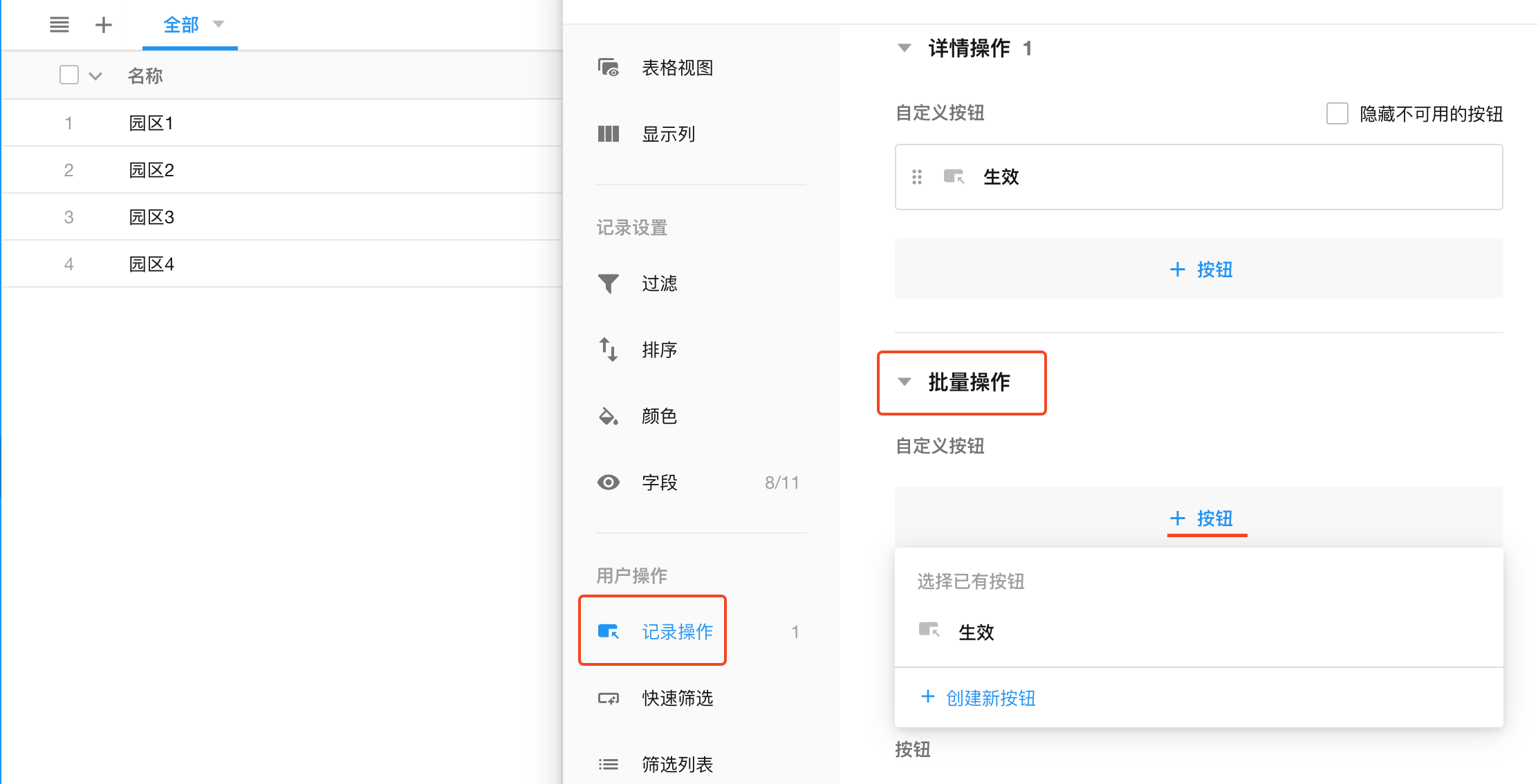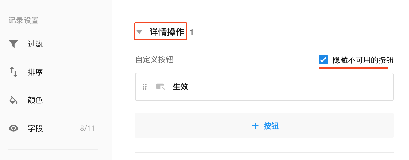 2)按钮只在批量操作下可用,记录详情中没添加此按钮