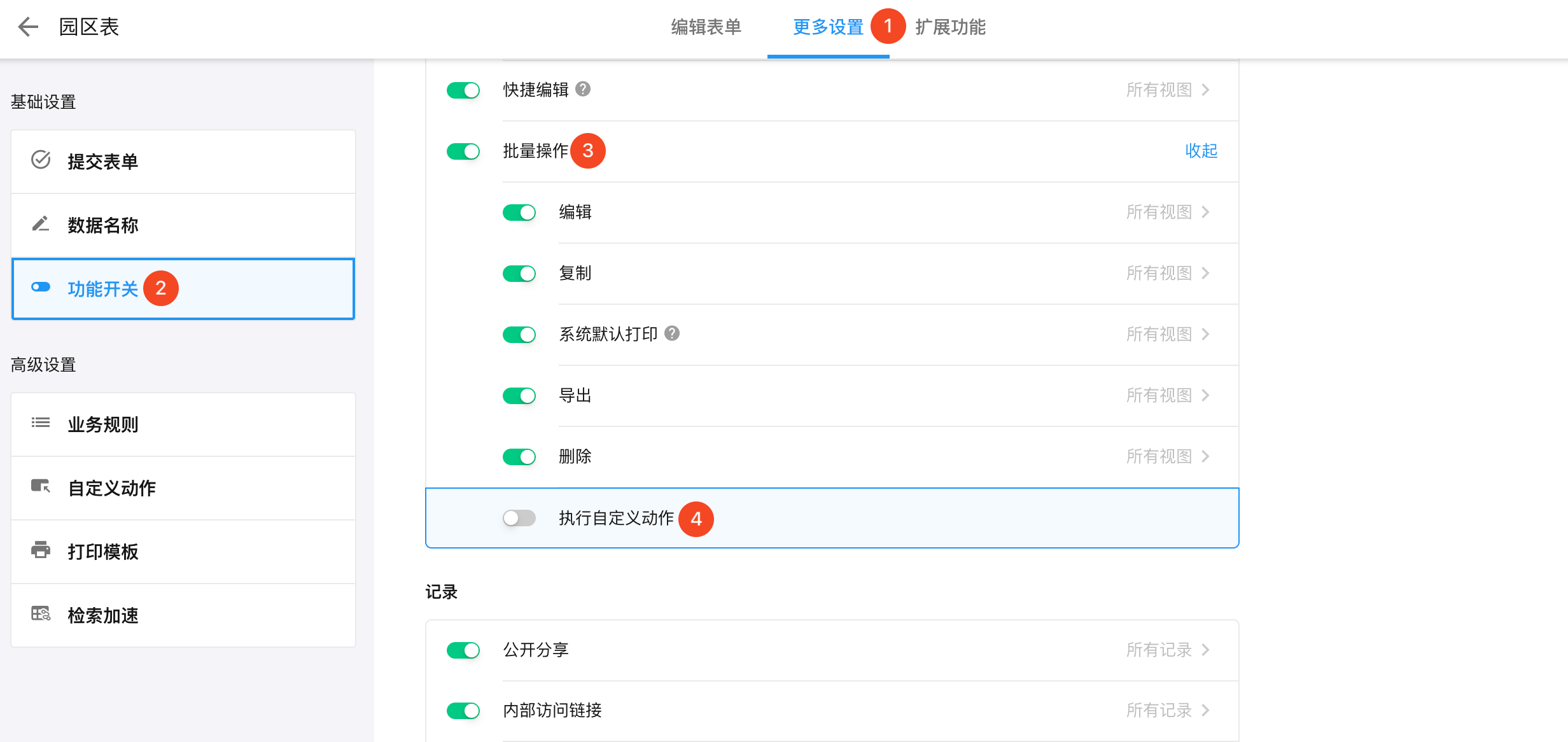 2) 在工作表功能开关中,批量操作下不允许执行自定义动作