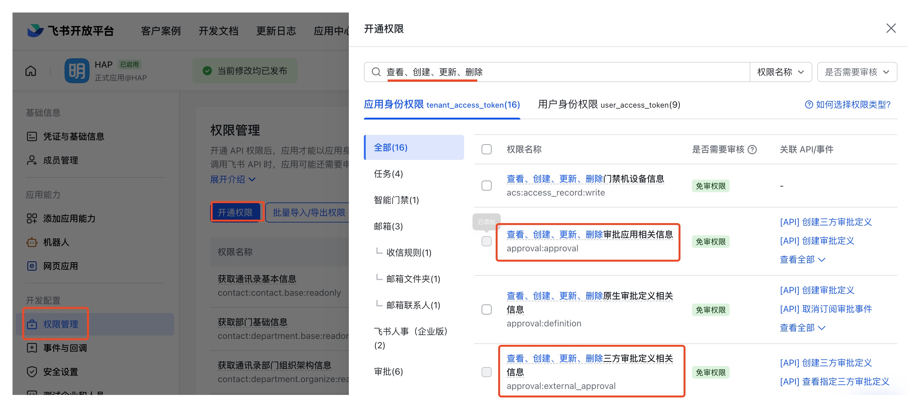 在“开发配置”-“权限管理”中,点击“开通权限”按钮,添加15个接口的权限(应用身份权限)。