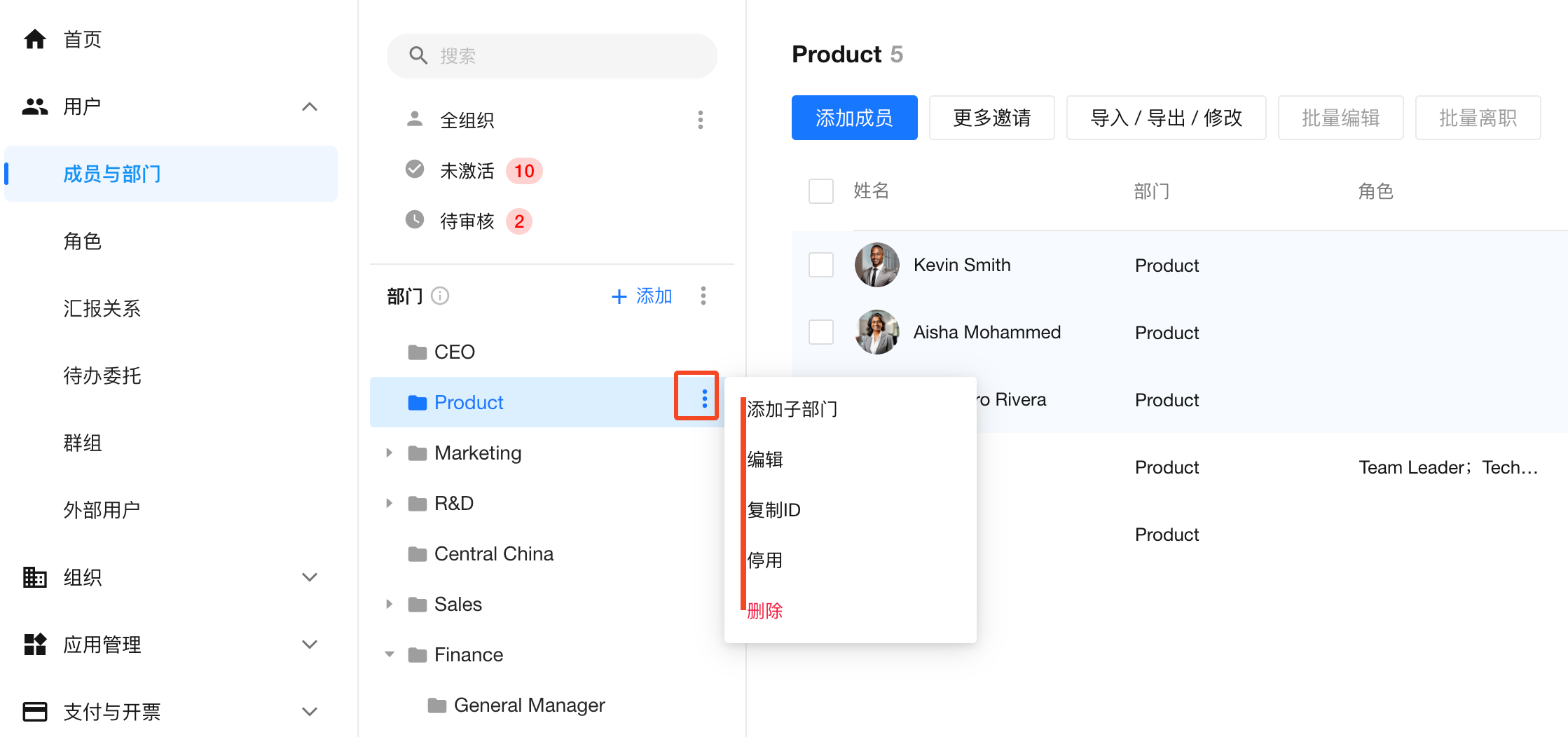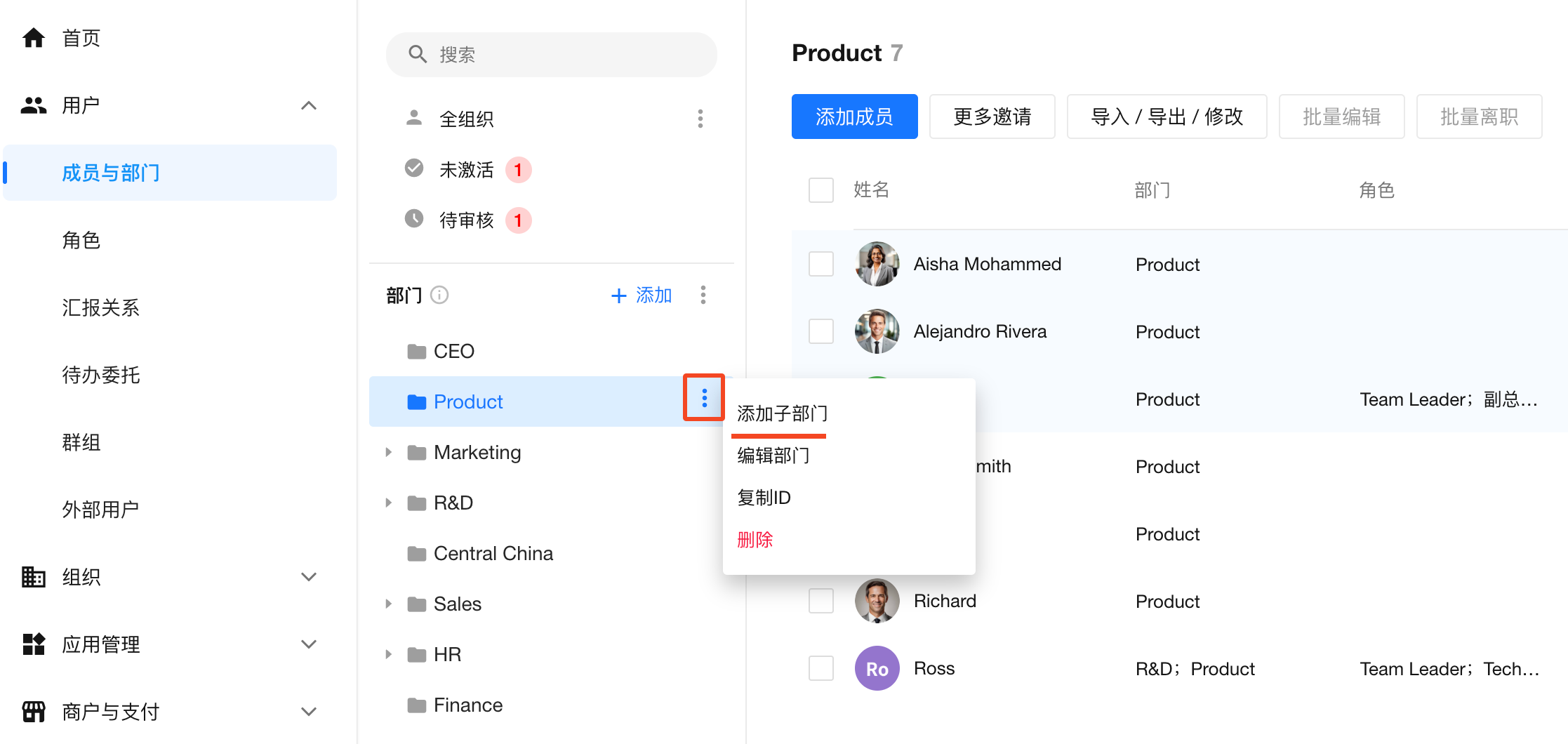 部门操作包括:添加子部门、编辑、停用、删除、复制部门ID。