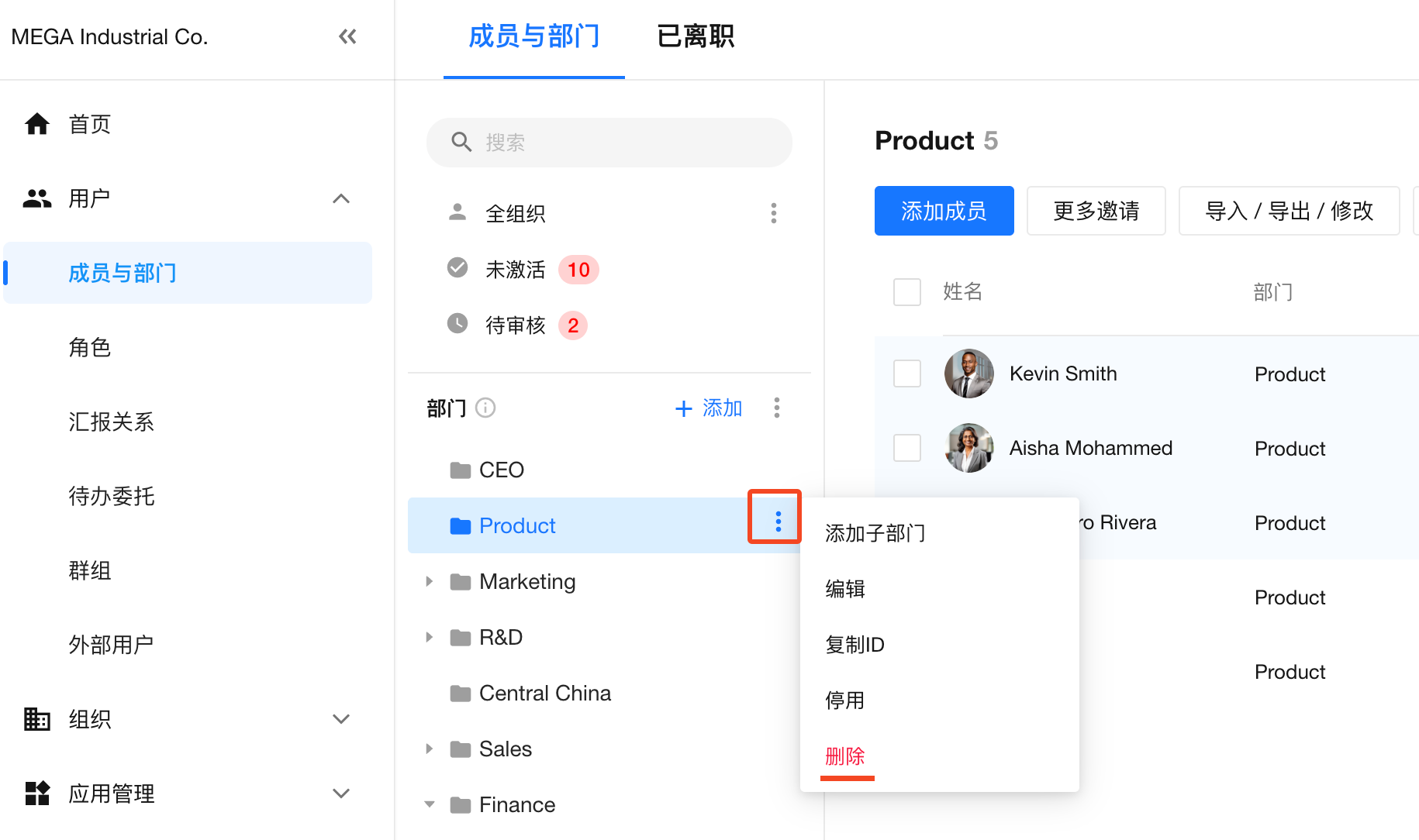 管理员仍可在组织管理的部门列表中查看并管理停用部门与其成员。