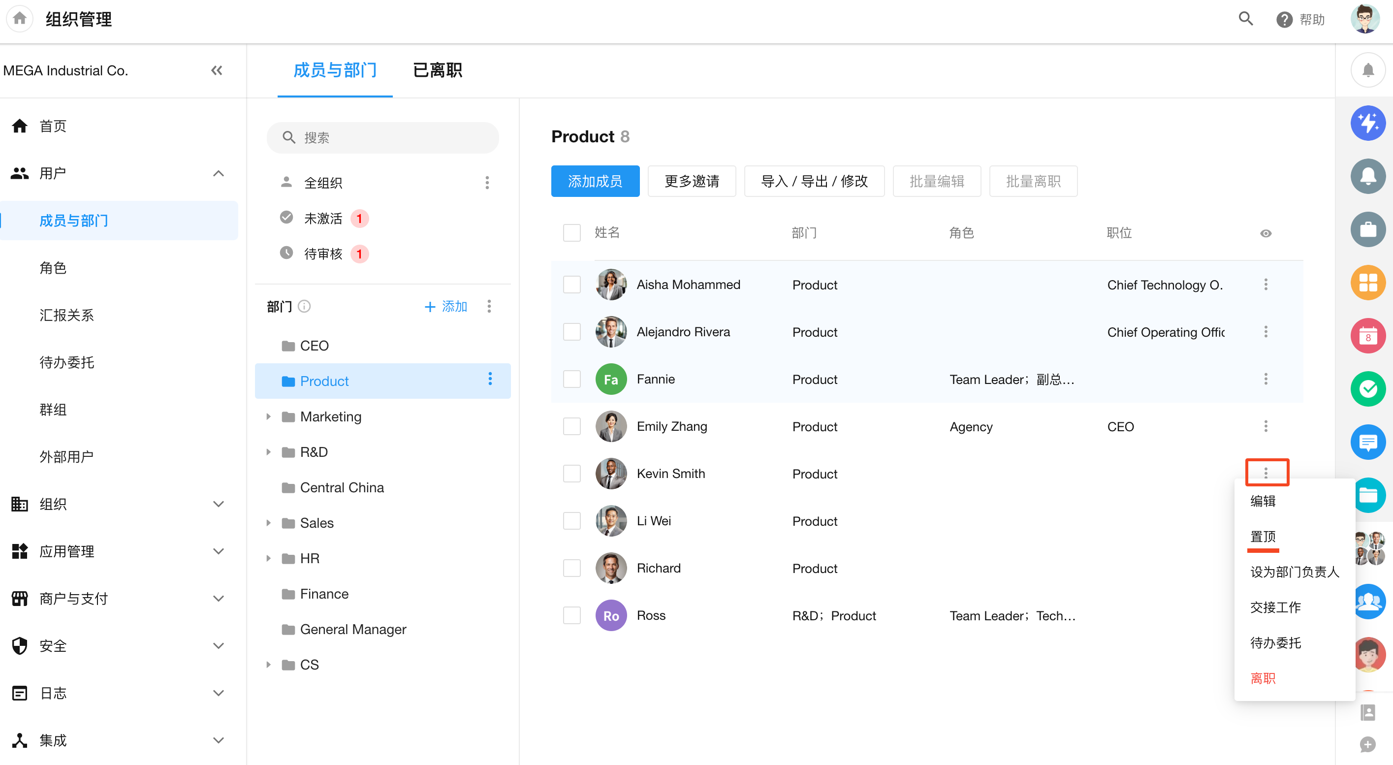 部门成员支持置顶显示,并可对置顶成员进行拖动排序。置顶人员的排序在查看通讯录、人员选择层中按部门查看时也会生效。