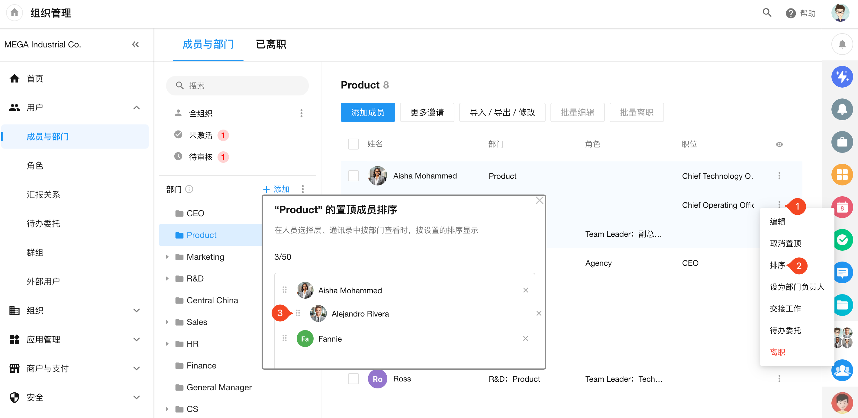 如果您希望部门成员的顺序完全按自定义排序,可将所有成员置顶,然后进行排序。