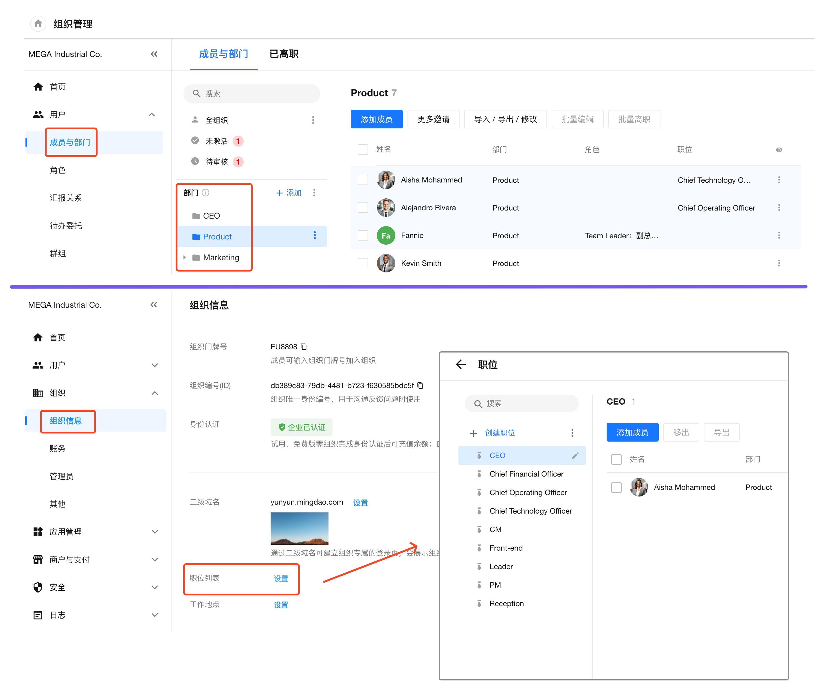 部门信息只能由管理员在组织后台的“成员与部门”模块下维护,职位信息“组织信息”-"职位列表"模块中维护。