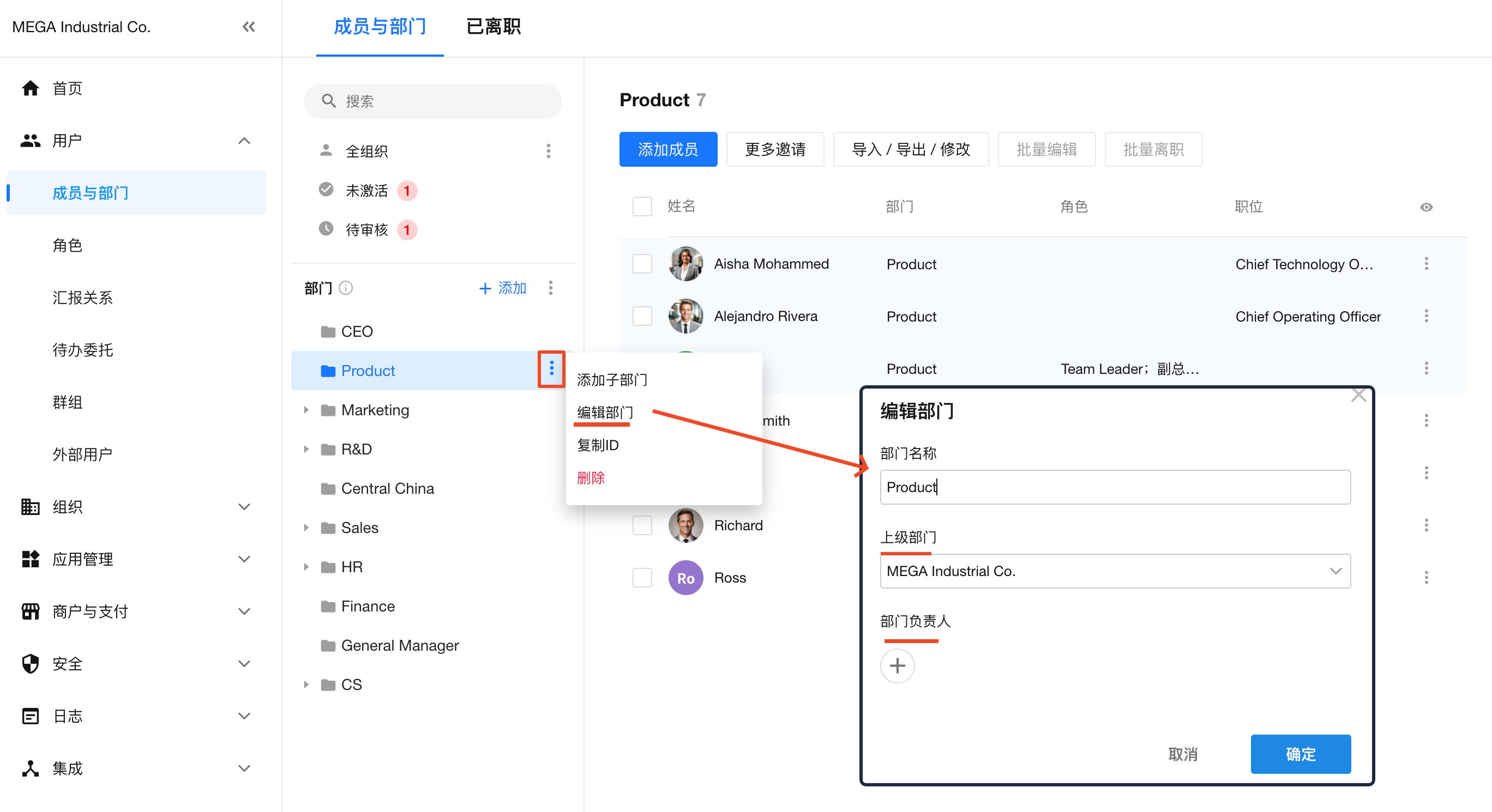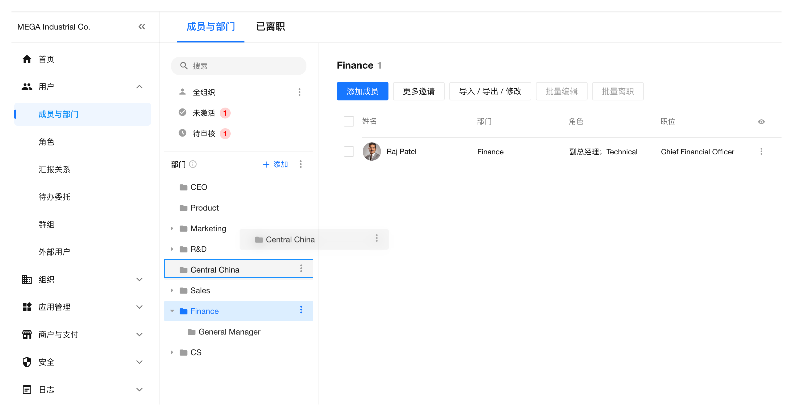 如何调整部门:部门创建完成后,在部门列表中,选择要调整的部门名称,然后点击右侧按钮,显示操作按钮。