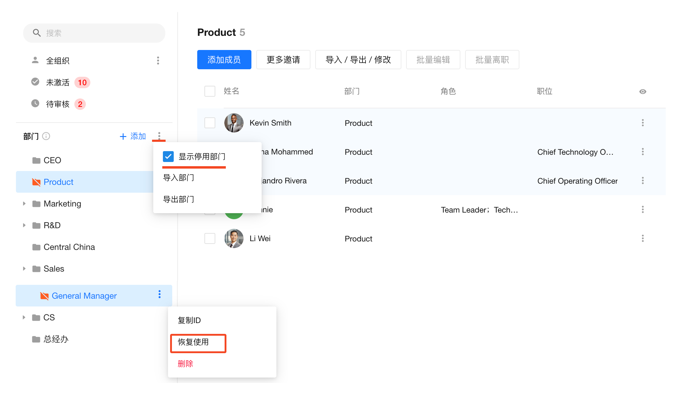 组织管理员可在部门列表查看并管理停用部门及其成员。