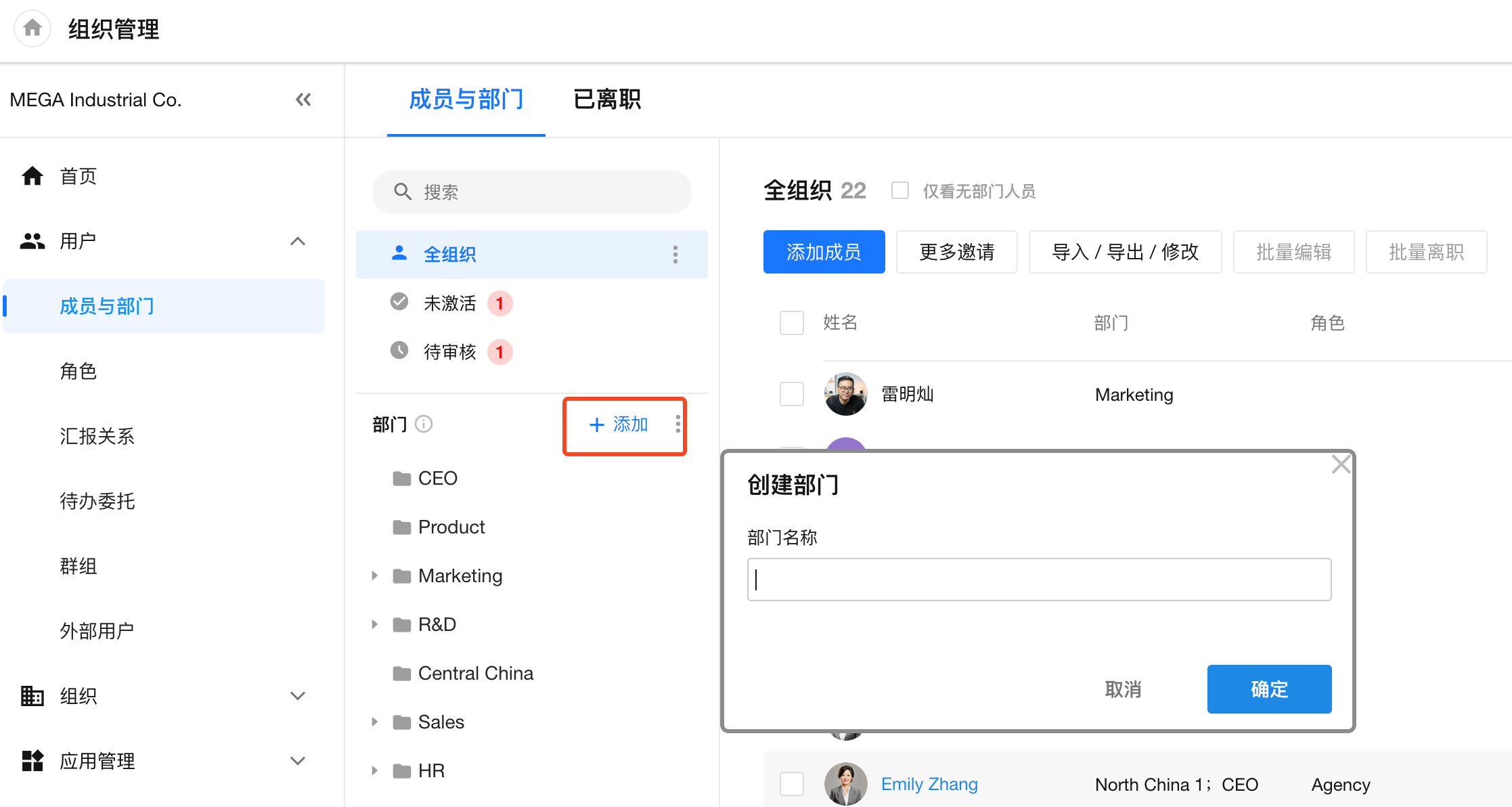在【成员与部门】下,点击"添加"按钮,设置部门名称。