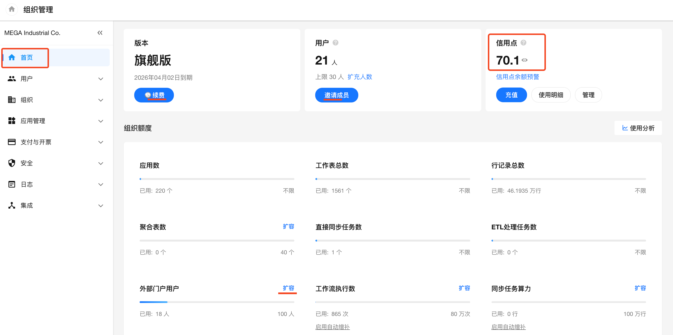 在管理首页,可以查看组织中各模块的使用情况和扩充入口。例如:授权版本信息和到期时间、当前用户量和额度、信用点和一些项目的自动购买管理。