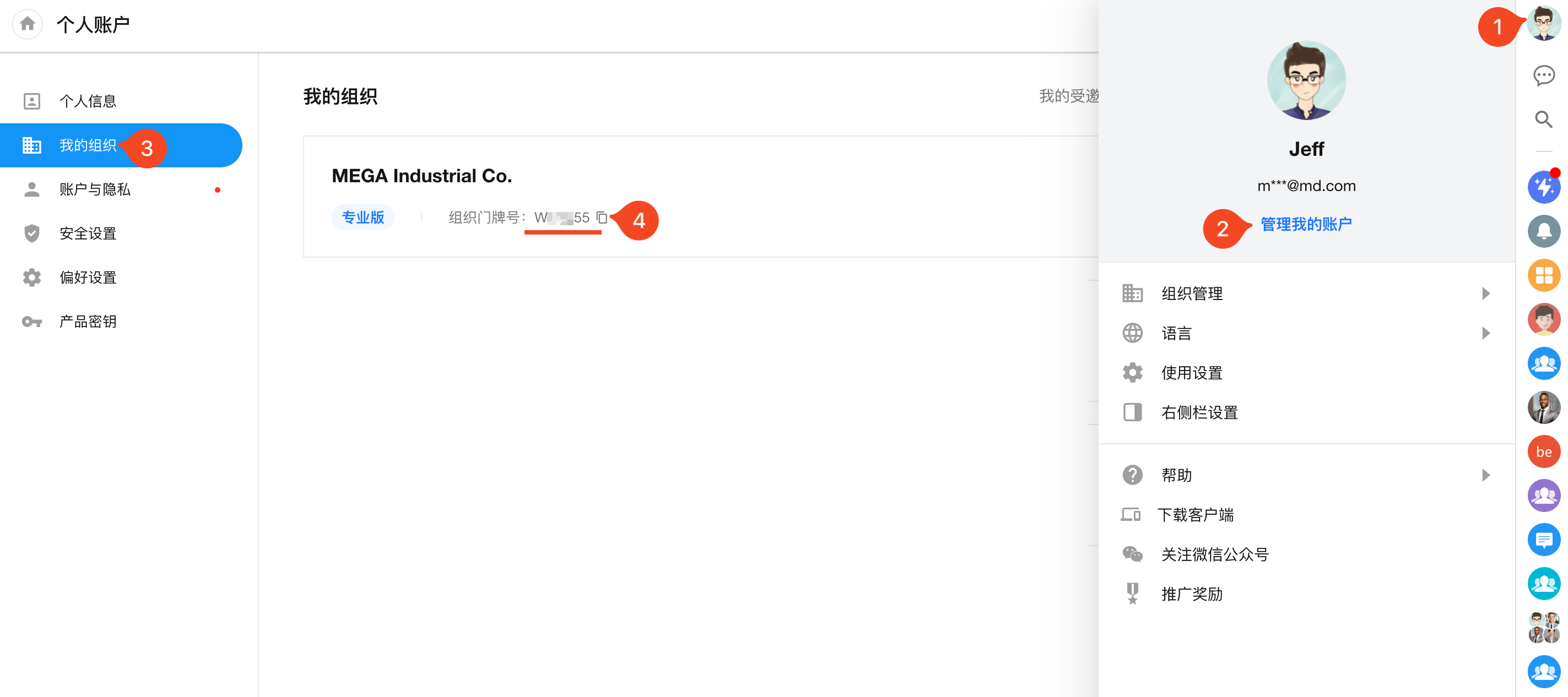 点击系统头像,依次点选“管理我的账户” > "我的组织",在组织卡片中可看到门牌号。