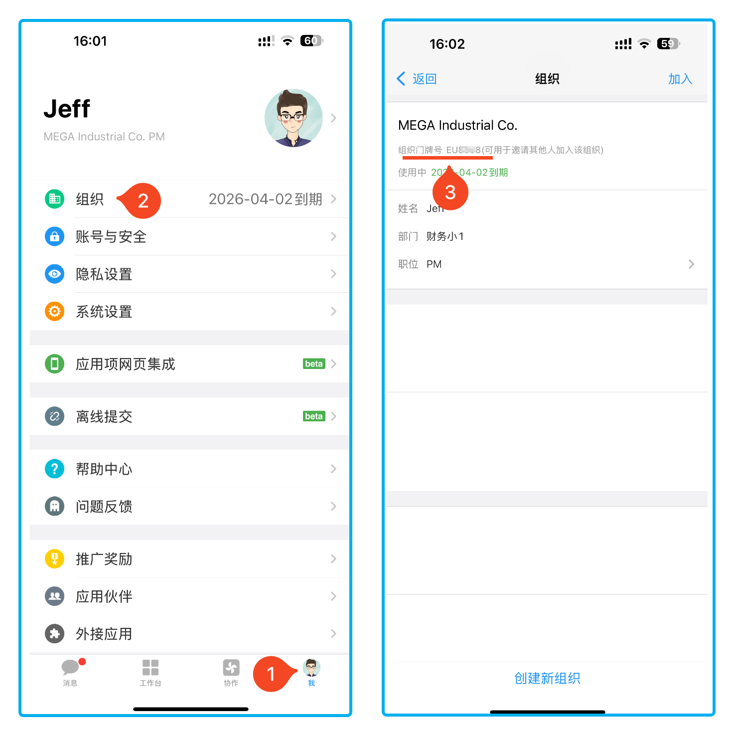 组织门牌号 ,是您的组织(企业、团队)在平台中的唯一标识,就像一家企业的统一社会信用代码。通过这个6位数的号码,可以找到并加入这个组织。通常在主动加入某个组织时需要使用组织门牌号。