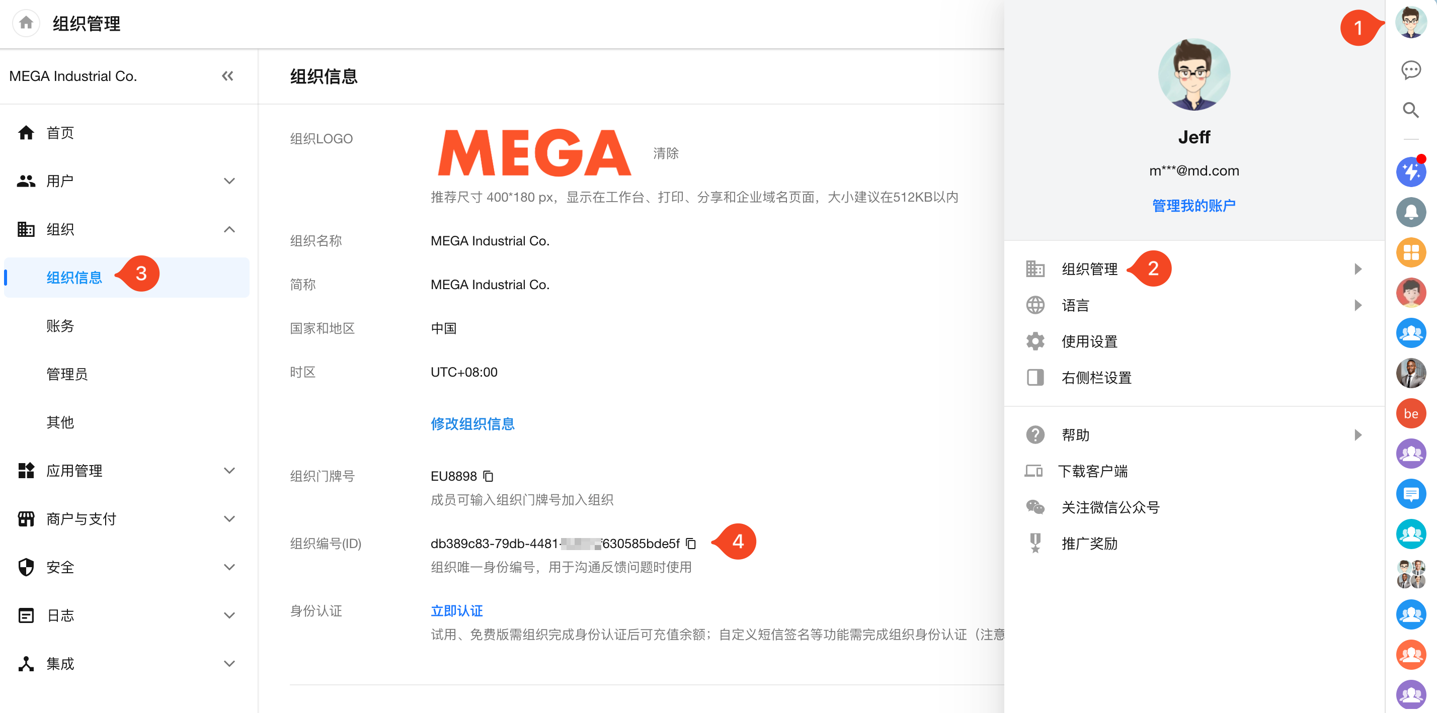 进入组织管理后台 >> 组织信息 ,复制组织编号。(手机端不支持获取)