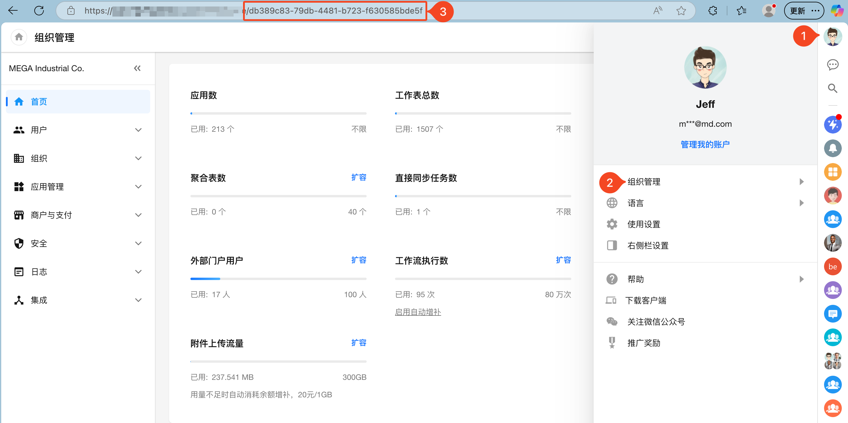 非管理员必须通过电脑浏览器登录平台,点击系统右上角头像,选择组织管理,然后从地址栏复制组织编号即可。