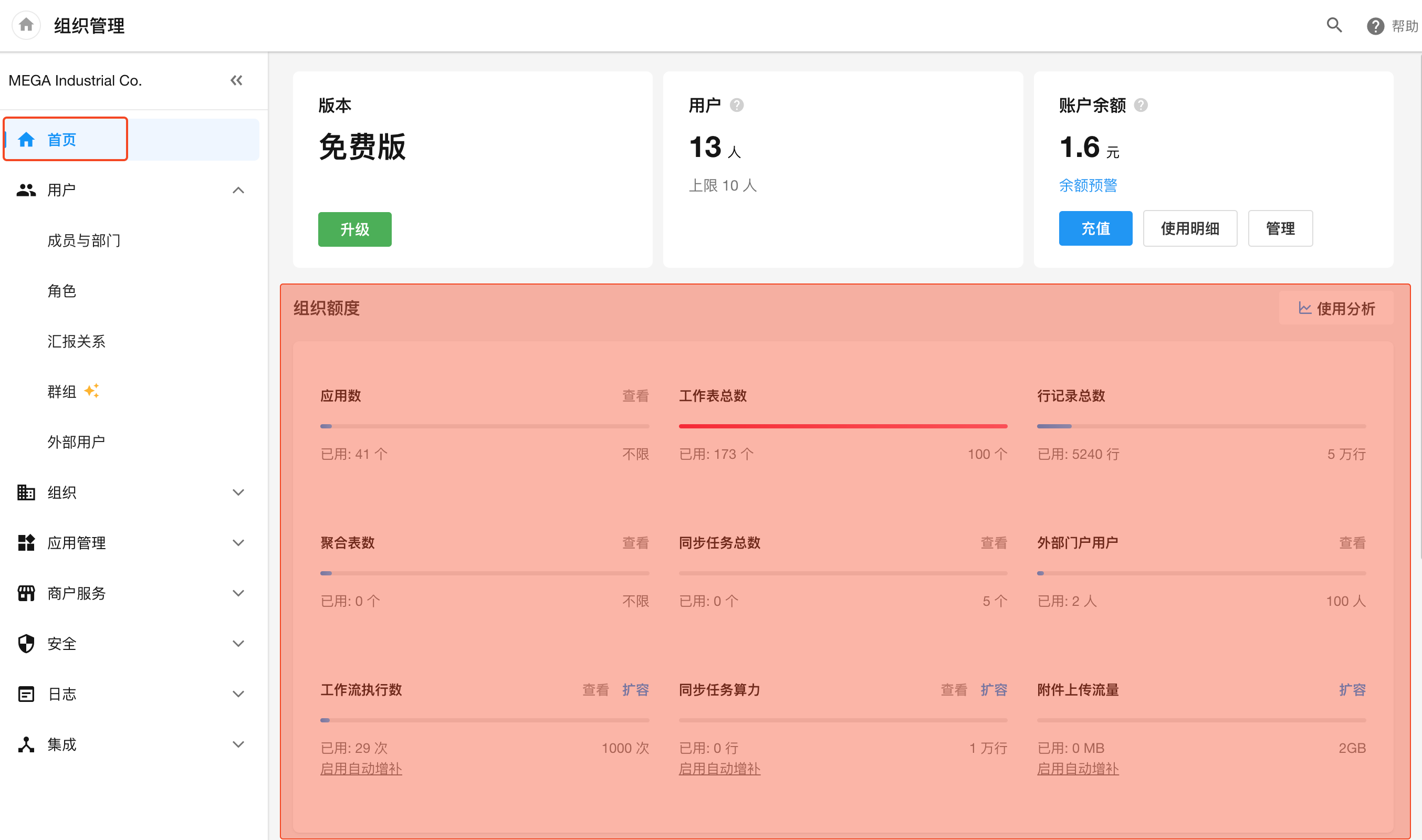 本页总览免费版常见问题 1、免费版的使用人数能够增加吗? 不能。 免费版组织内仅支持10人用户,且不能扩充。 2、能上传多少附件,能增加吗? 免费版下,应用中可上传的附件是每年2G, 所有人共享这2G。 私聊或群聊中发送的附件不计入流量 3、工作流每月执行1000次, 如何增加? 不能增加,不支持扩充执行数量。完成组织认证后,可以扩充执行量。 4、如何查看当前用量 在组织管理后台的首页,可以看到各种用量的统计情况。
