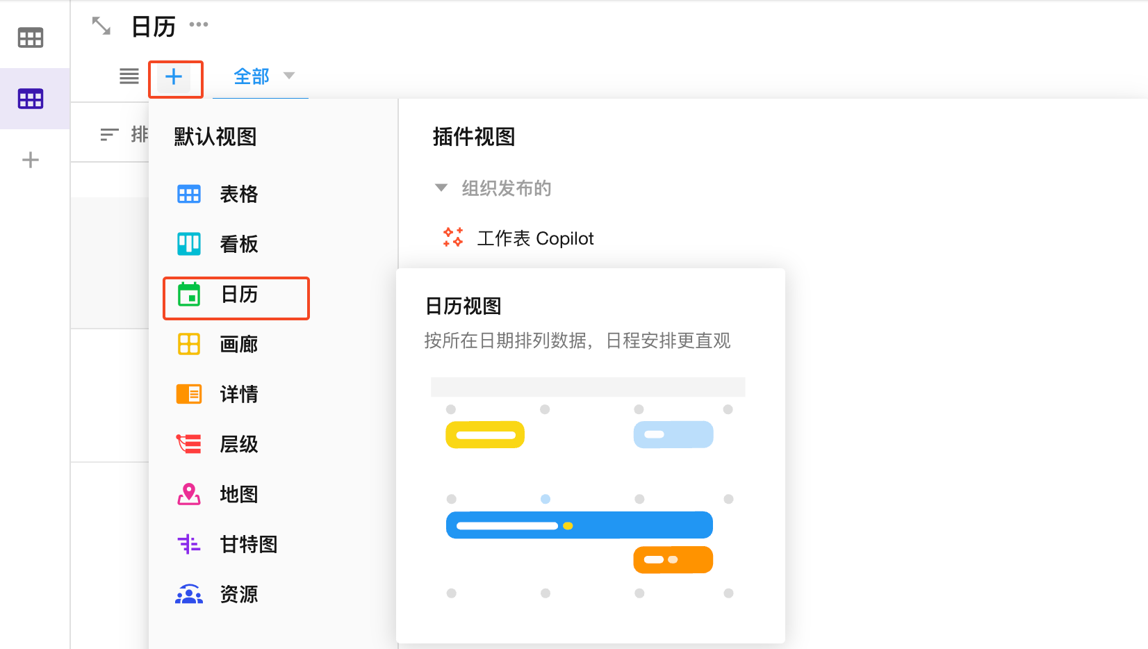 1、点击+ 按钮,选择“日历”视图