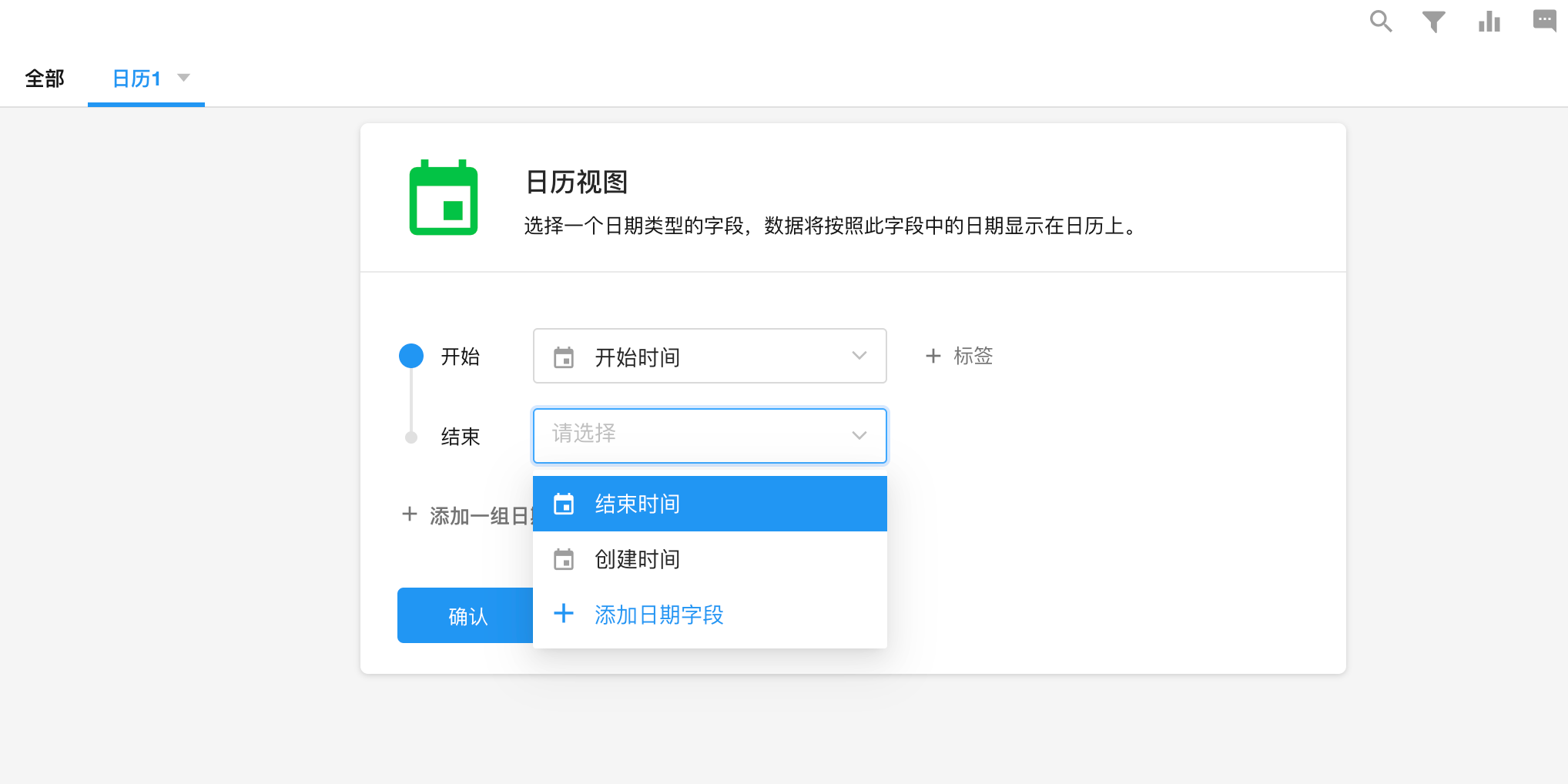 日历视图中,至少且必须要有一个日期字段作为“开始”,作为组成日历的日期线。如果您的业务需要有严格的计划,例如任务的开始和结束时间,则可以选择另一个日期字段作为结束。日期字段选择后,点击确认,记录就自动填充到日历中了。