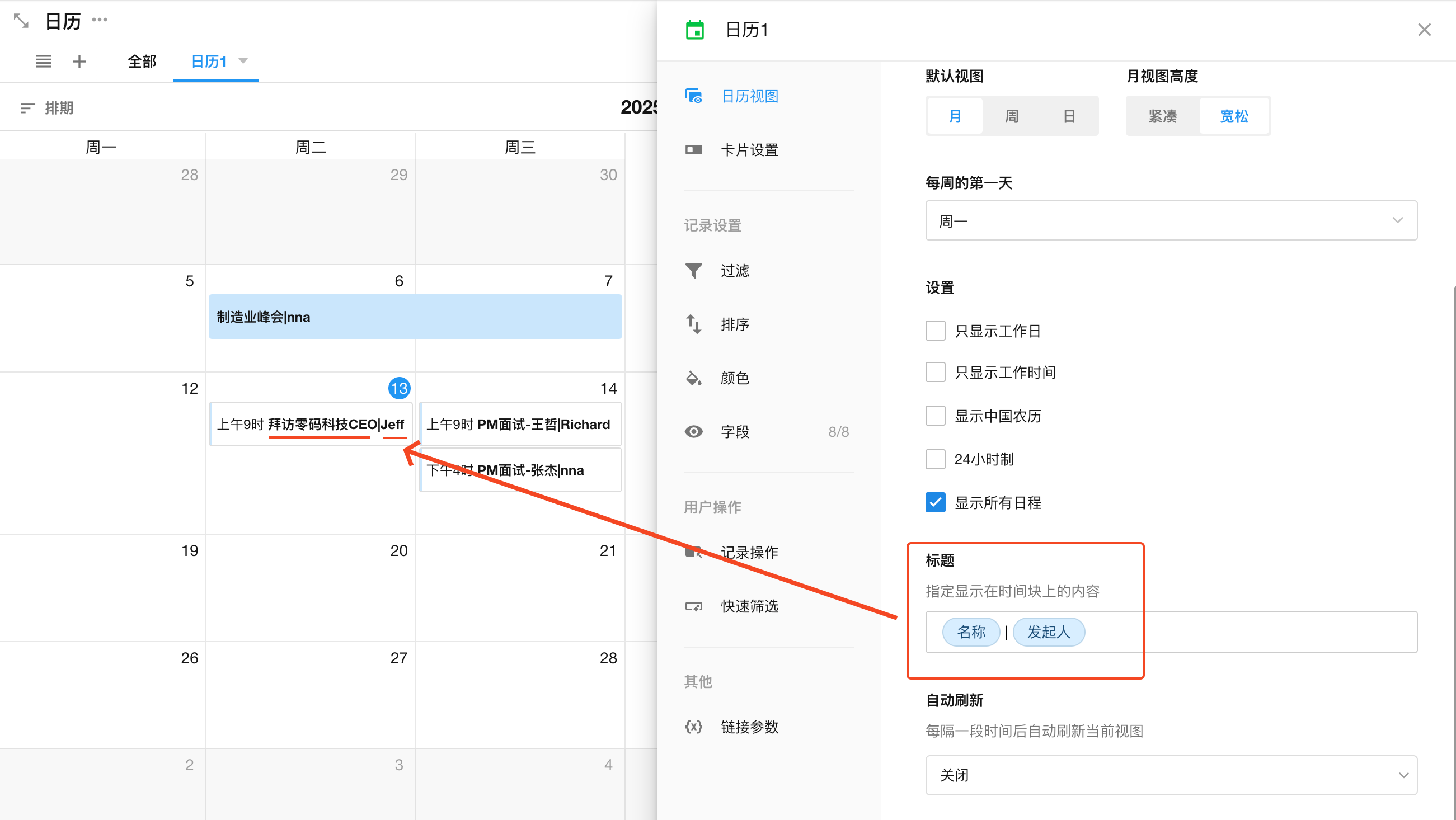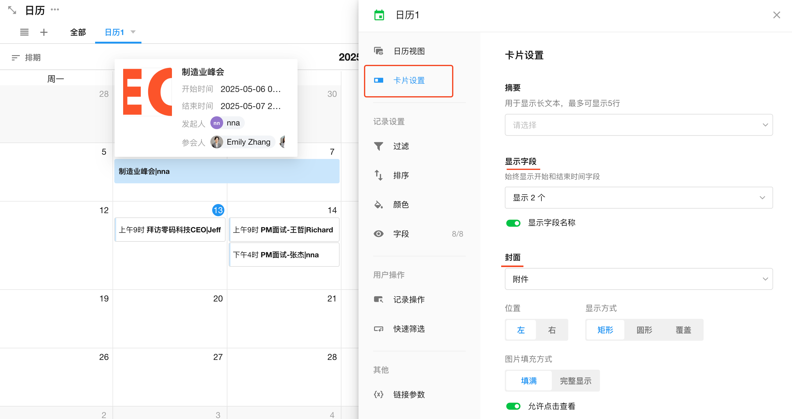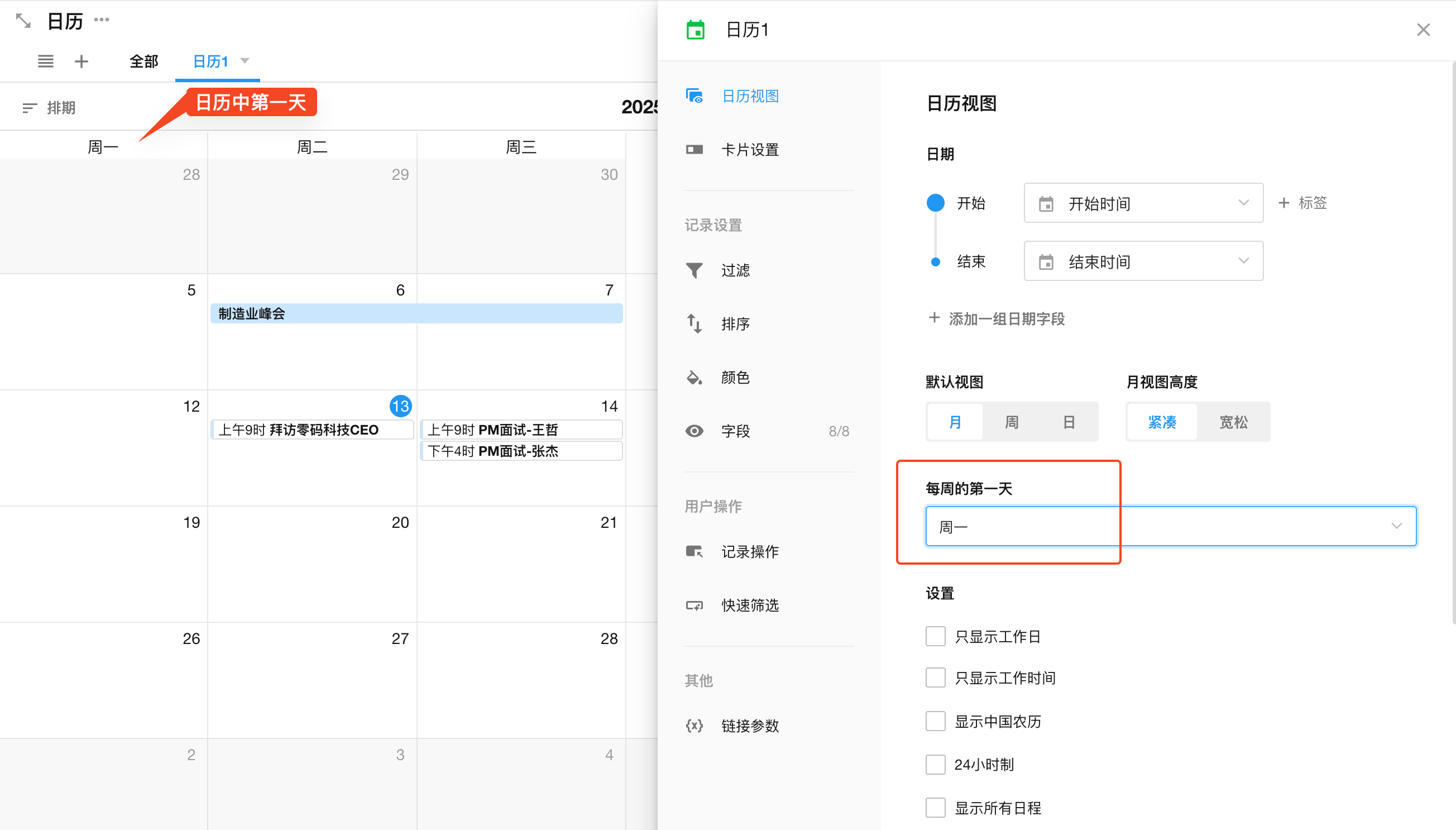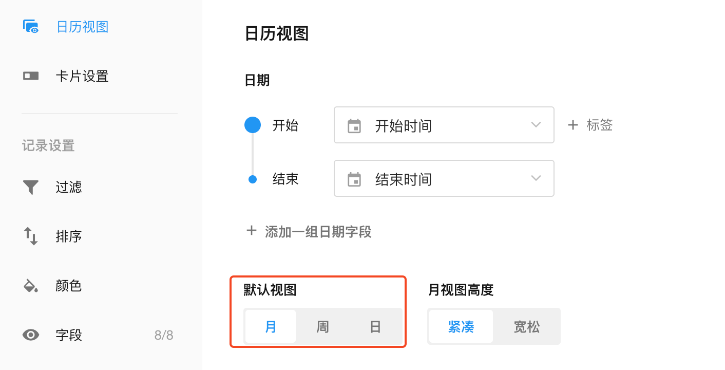 日历视图中,至少且必须要有一个日期字段作为“开始”,作为组成日历的日期线。如果您的业务需要有严格的计划,例如任务的开始和结束时间,则可以选择另一个日期字段作为结束。日期字段选择后,点击确认,记录就自动填充到日历中了。