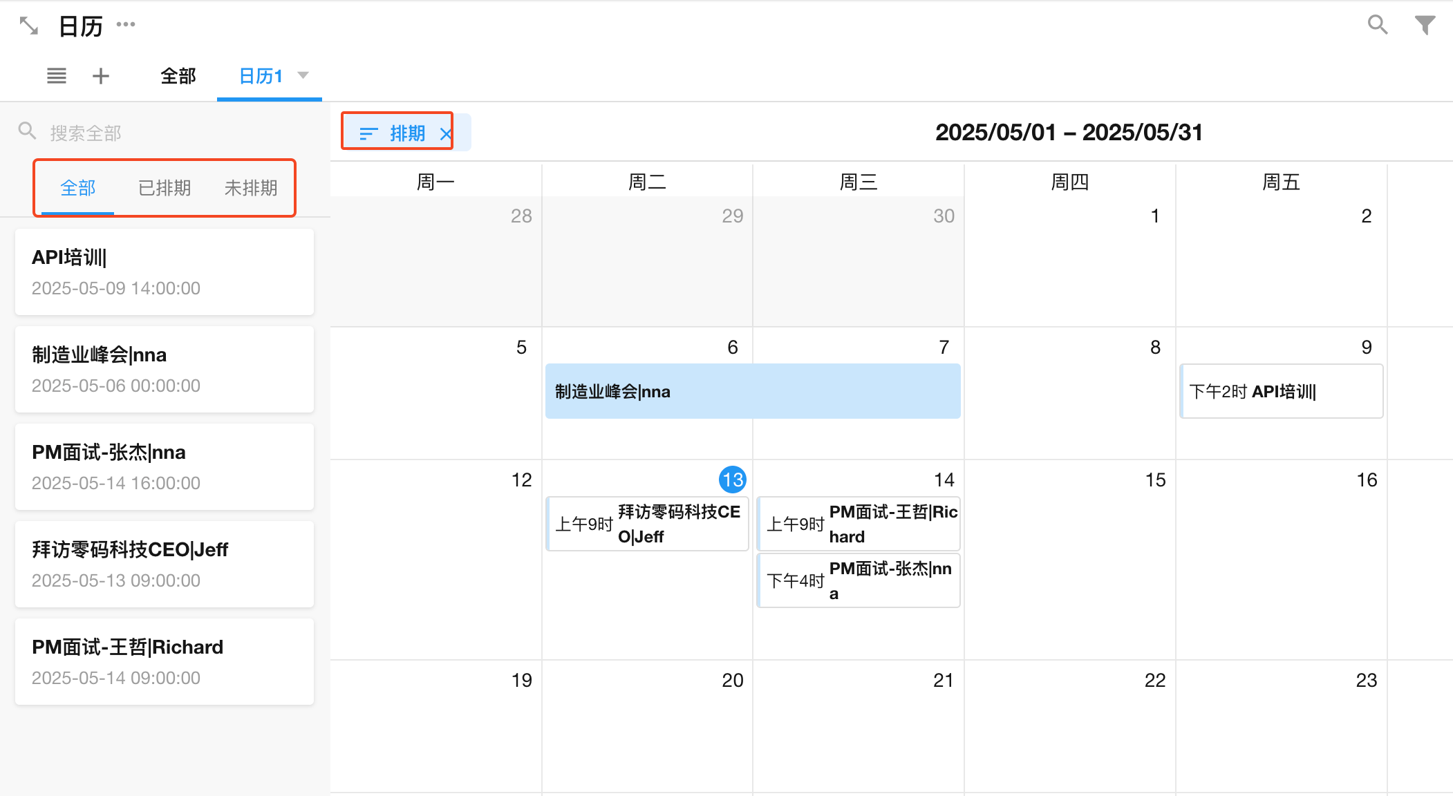 日历视图能帮助你更好地管理和时间相关的记录数据,像销售拜访、课程、生产计划等业务,需要安排每一天的业务计划,什么时候开始?什么时候结束?持续多久?今天有哪些事项需要处理?明天有多少需要完成?在日历视图下都一目了然。