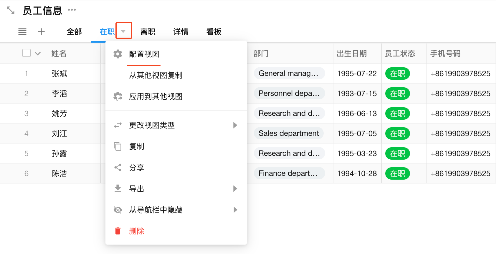 单击视图名称,然后点击视图名称右侧的按钮,然后选择“复制”或“删除”。复制视图和删除视图都不会影响表数据。