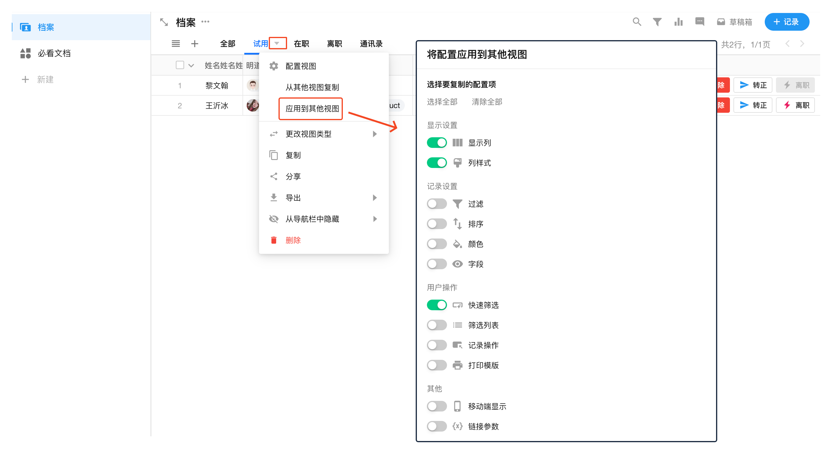 单击视图名称,然后点击视图名称右侧的按钮,选择 “应用到其他视图”,将本视图的配置应用到其他视图中,将覆盖其他视图的配置。