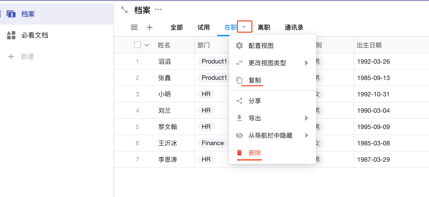单击视图名称,然后点击视图名称右侧的按钮,然后选择“复制”或“删除”。复制视图和删除视图都不会影响表数据。