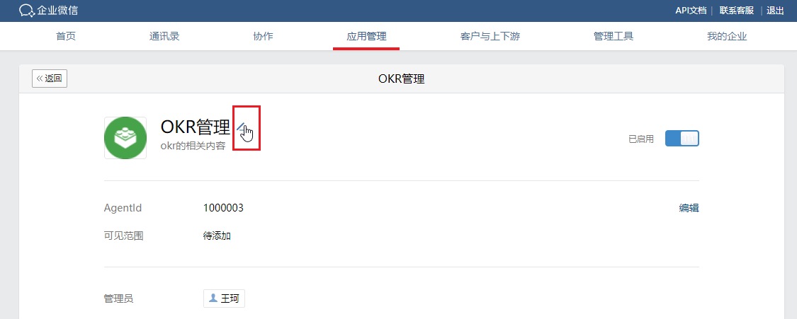 对接完成后,进入企业微信后台,通过 应用管理 > 应用 > 自建应用栏,找到对接应用OKR。然后可以修改图标、名称和描述。