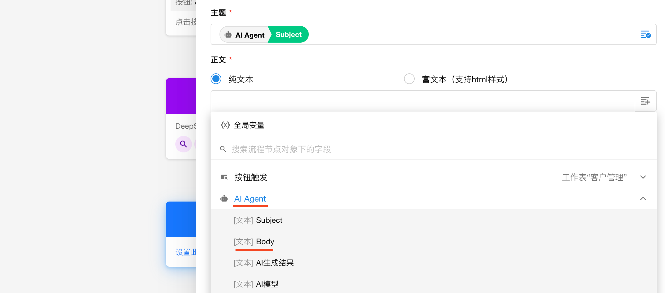 可通过变量引用上游节点数据,如客户名称、最近跟进时间等。