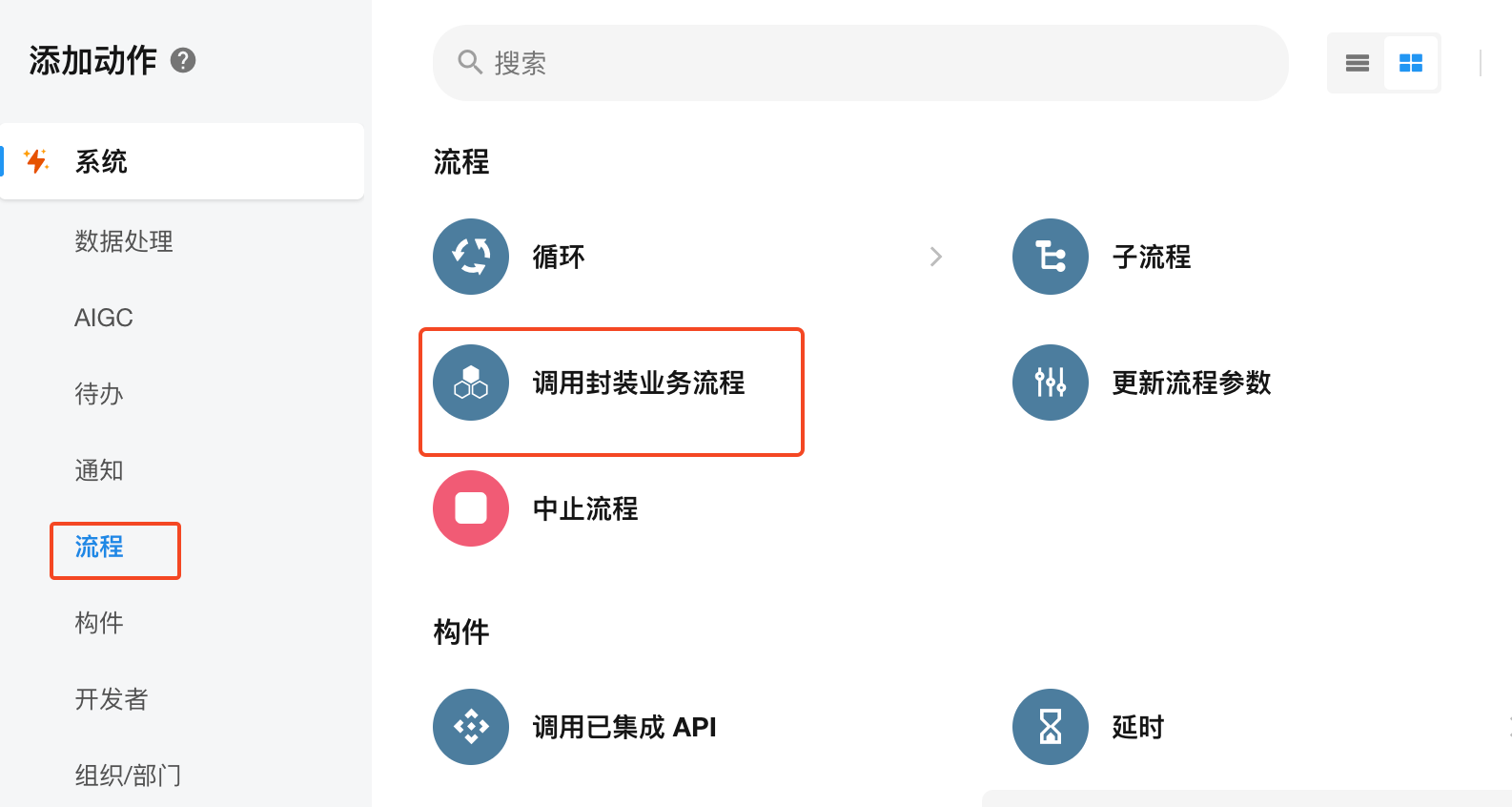 通过此节点,可以调用组织内的封装业务流程,调用封装业务流程时,支持单次执行和多次执行。