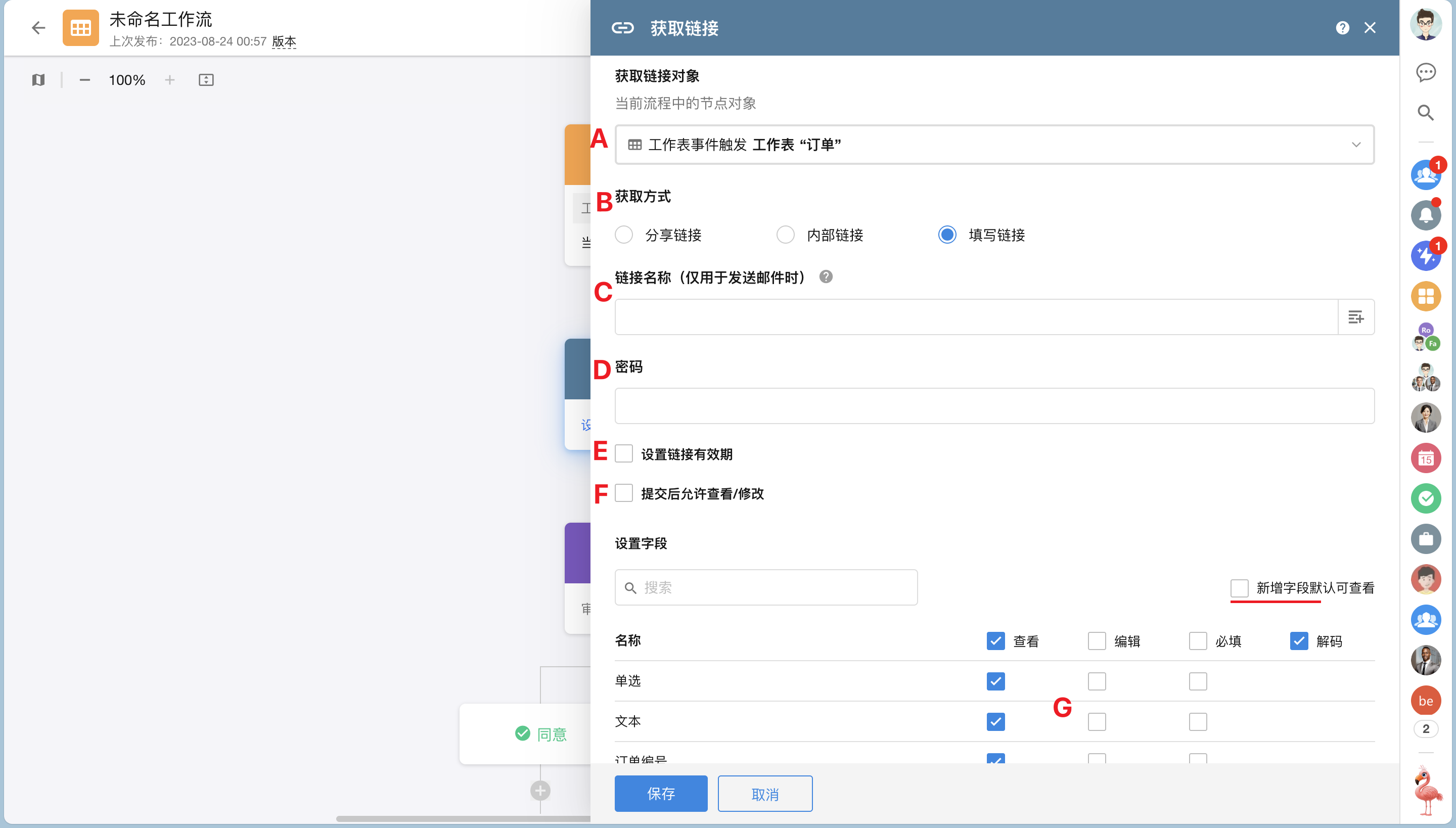 即打开链接后,需要配置查看人哪些字段可见,哪些字段可填写,哪些字段必须填写。