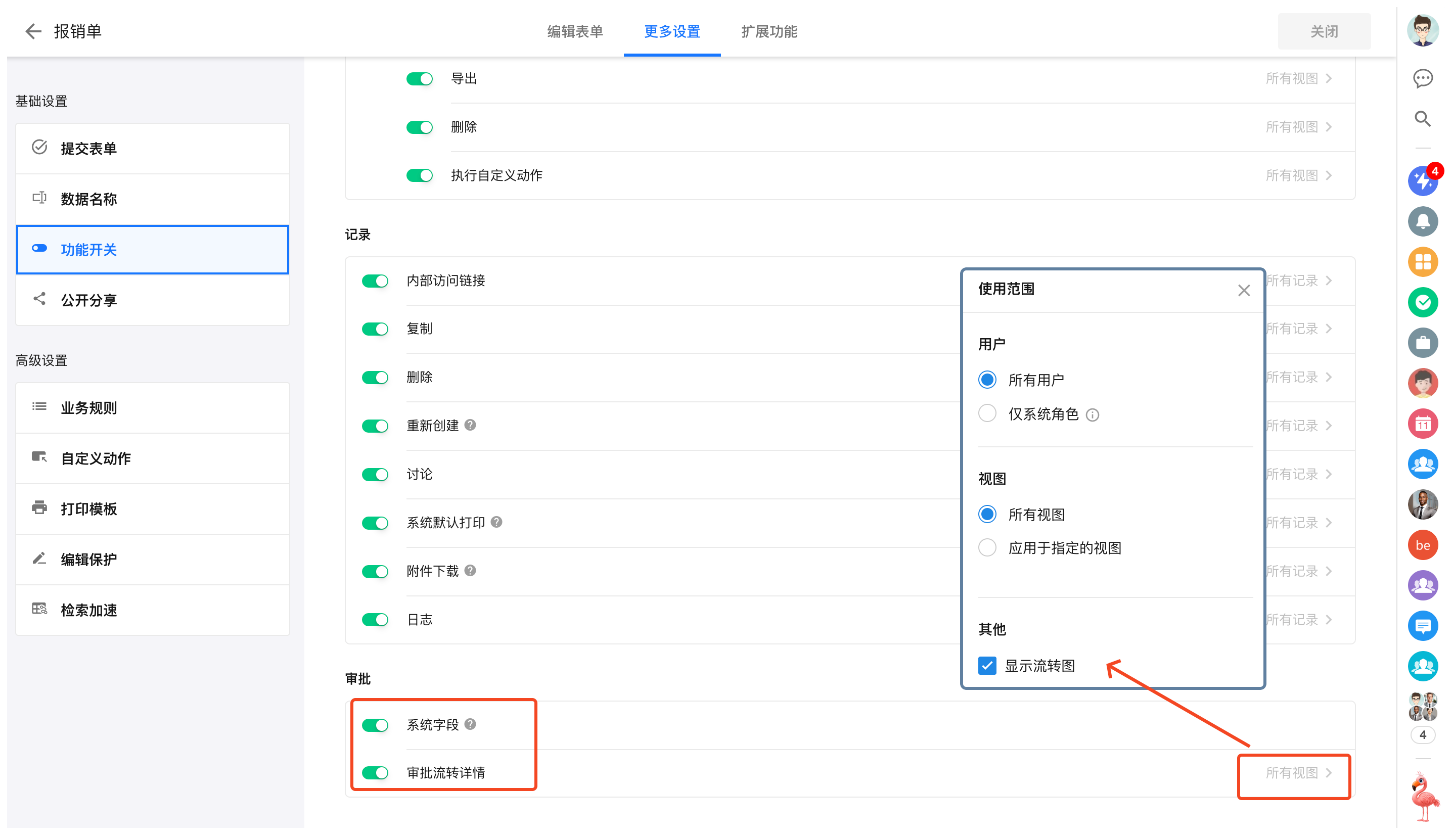 进入工作表的功能开关页面,启用审批系统字段和审批流转图。