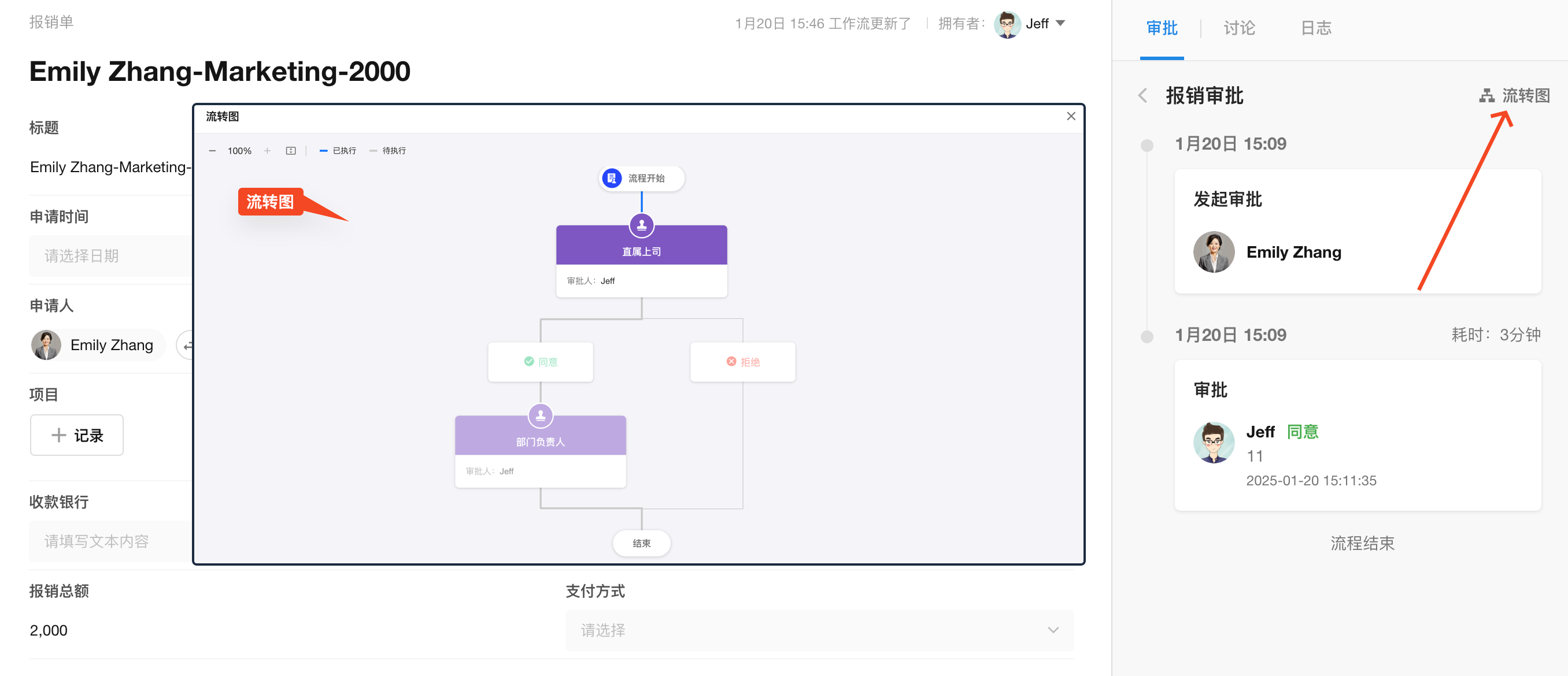 定义好发起审批的节点名称,在审批流程列表、通知提醒、打印等地方都会显示此名称。