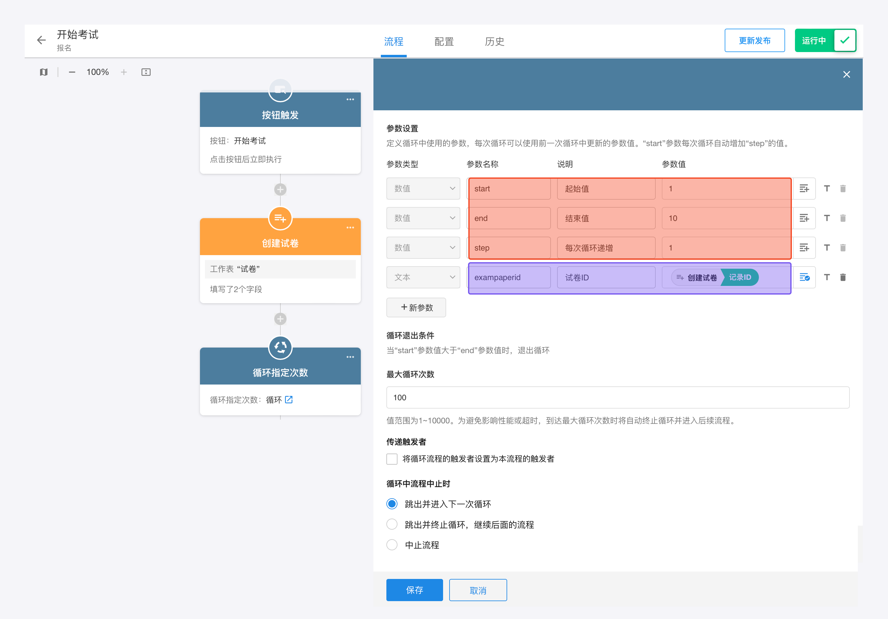 除了固定参数,还支持传入自定义参数。如本次场景中每次循环时都需要获取新建的试卷记录,那么就需要传入试卷记录ID(exampaperid),在循环流程中通过记录ID获取到试卷记录。