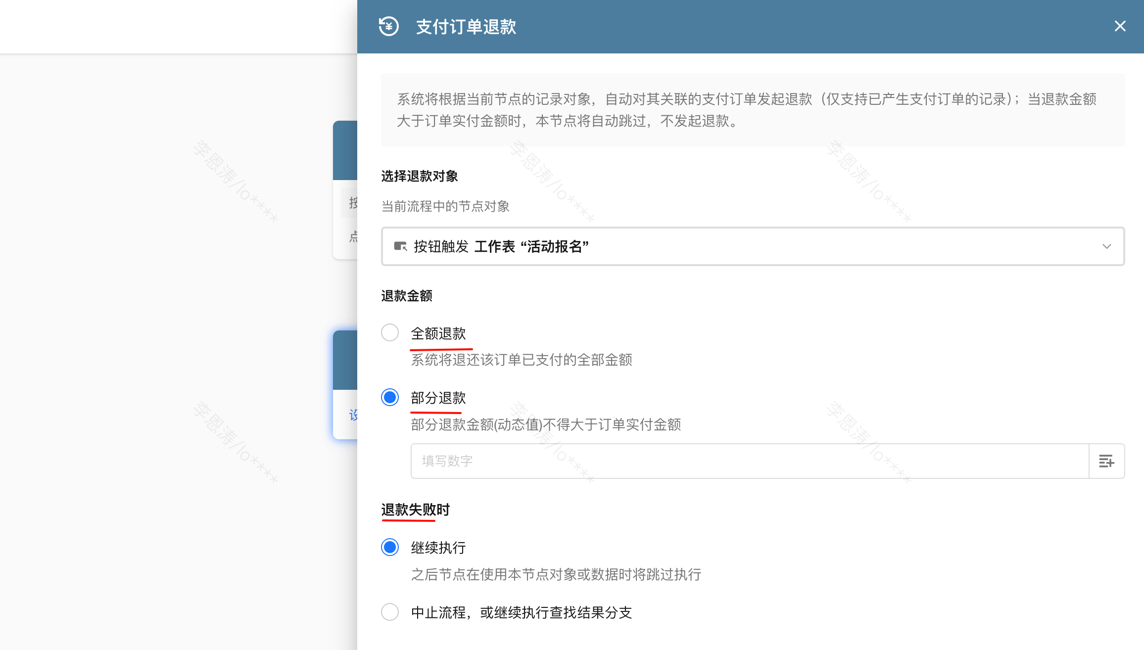 • 若退款失败不继续执行后续节点,可选择“中止流程”